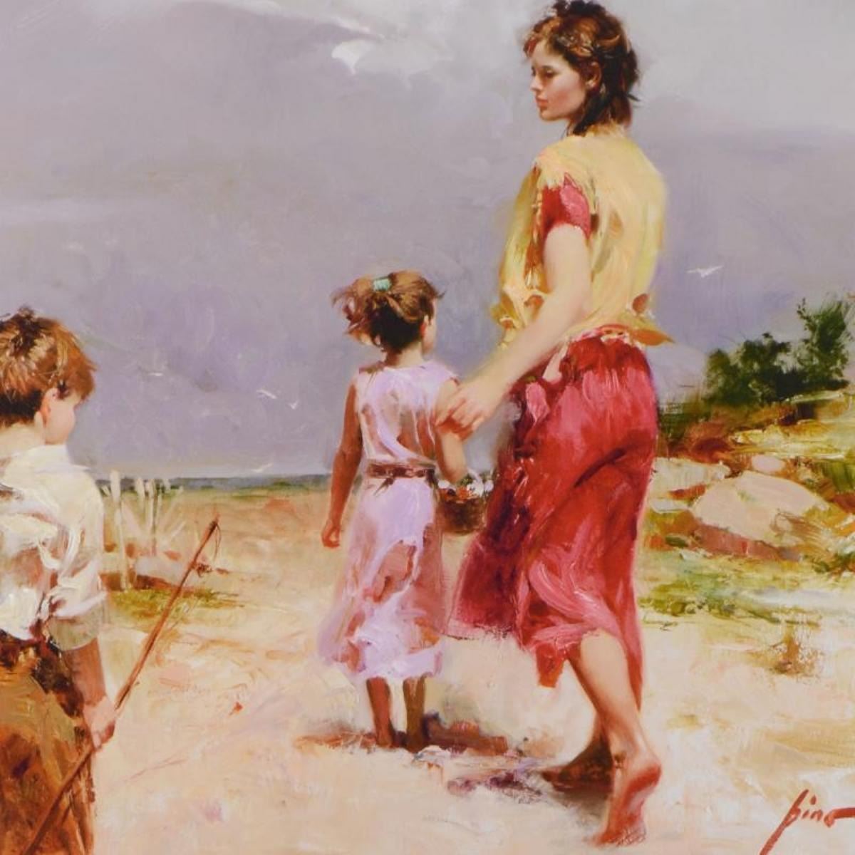 Pino's portraits allow glimpses into intensely personal, intimate spaces, conveying emotion through rich, warm color and sensual brushwork. "Going Fishing" is an artist-embellished limited edition giclee on canvas by Pino (1939-2010). The piece is numbered, hand signed, custom framed, and includes certificate of authenticity. Measures approx. 35.5" x 35.5" (frame), 24" x 24" (image).