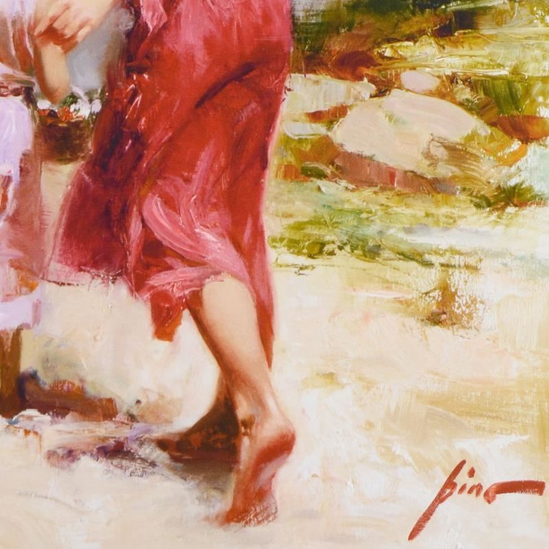 Going Fishing by Pino (1939-2010). Pino's portraits allow glimpses into intensely personal, intimate spaces, conveying emotion through rich, warm color and sensual brushwork. "Going Fishing" is an artist-embellished limited edition giclee on canvas by Pino (1939-2010). The piece is numbered, hand signed, and includes certificate of authenticity. Measures approximately 24" x 24" (image).