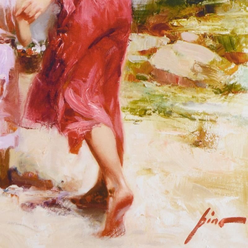 Pino's portraits allow glimpses into intensely personal, intimate spaces, conveying emotion through rich, warm color and sensual brushwork. "Going Fishing" is an artist-embellished limited edition giclee on canvas by Pino (1939-2010). The piece is numbered, hand signed, and includes certificate of authenticity. Measures approximately 24" x 24" (image).