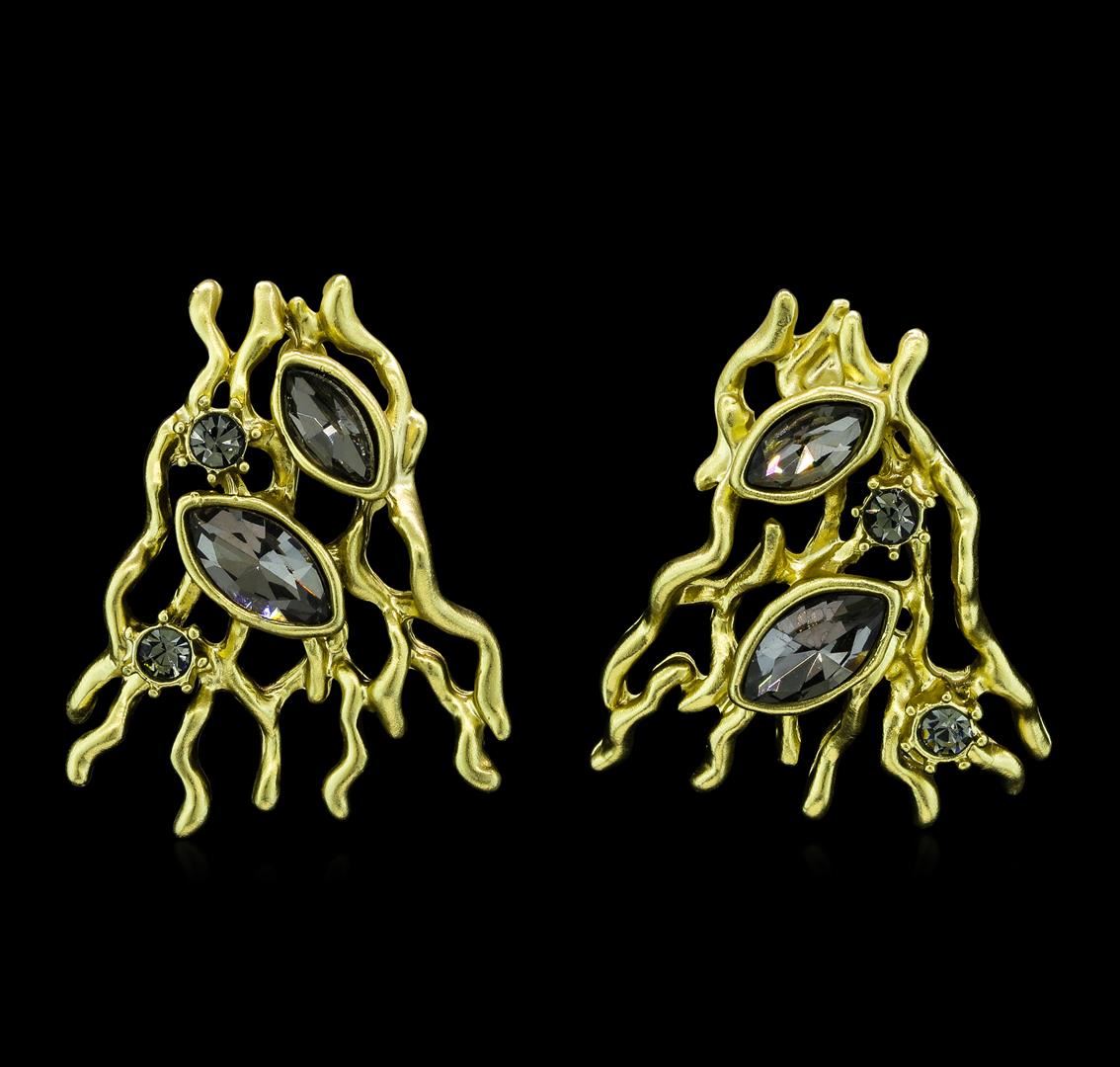 High end designer jewelry. Gold Branches Crystal Earrings - Gold Plated. Gold Plated Metal/1.5" Drop. Gold/ Smoky. Post.