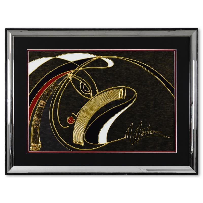 "Golden Sorrow" is a limited edition mixed media silkscreen on paper by Martiros Manoukian, PP numbered 1/15 and hand signed by the artist. This piece comes custom framed with a mirror-like finish. Includes Letter of Authenticity. Measures approx. 37.5" x