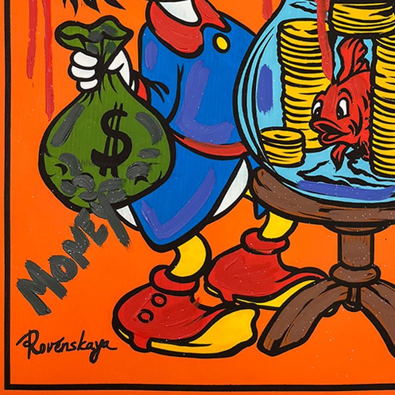 "Goldfish" is a one-of-a-kind mixed media on deckle edge paper by Nastya Rovenskaya; hand signed by the artist. This piece comes custom framed and includes letter of authenticity. Measures approximately 36" x 30.5" (framed), 30" x 24.5" (image). This item requires special handling and may have a longer than usual turnaround.