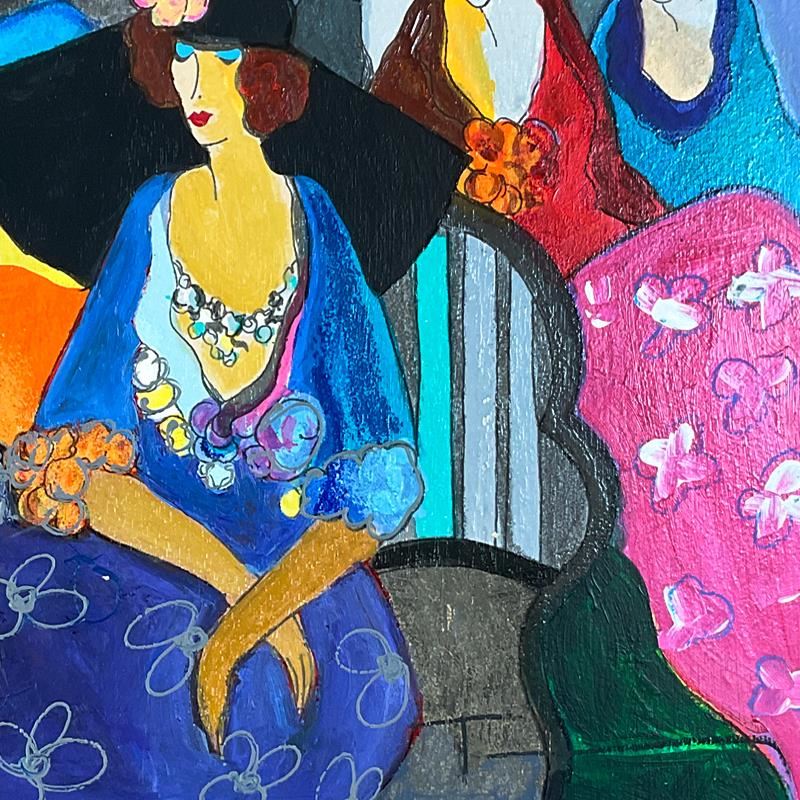 "Gossip" is a one-of-a-kind mixed media over paint on wood by Itzchak Tarkay (1935-2012), hand signed by the artist. This piece comes custom framed. Includes Letter of Authenticity. Measures approx. 17" x 19.5" (frame), 9" x 11.5" (image). This item requires special handling and may have a longer than usual turnaround.