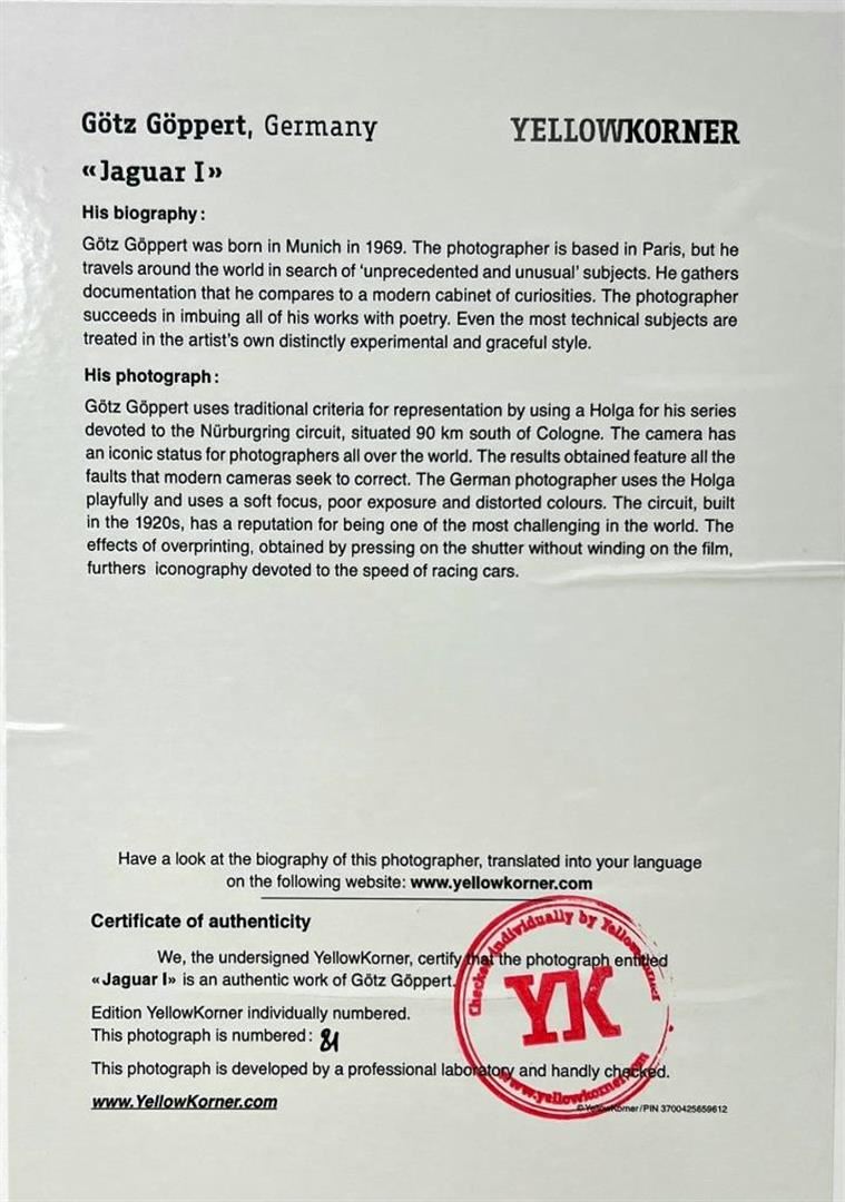 Gotz Goppert Germany Jaguar I YellowKorner Certified Photograph. Certificate of Authenticity from YellowKorner affixed to the back. Matted Dimensions 16"x20". Protected with Clear Mylar Sleeve.