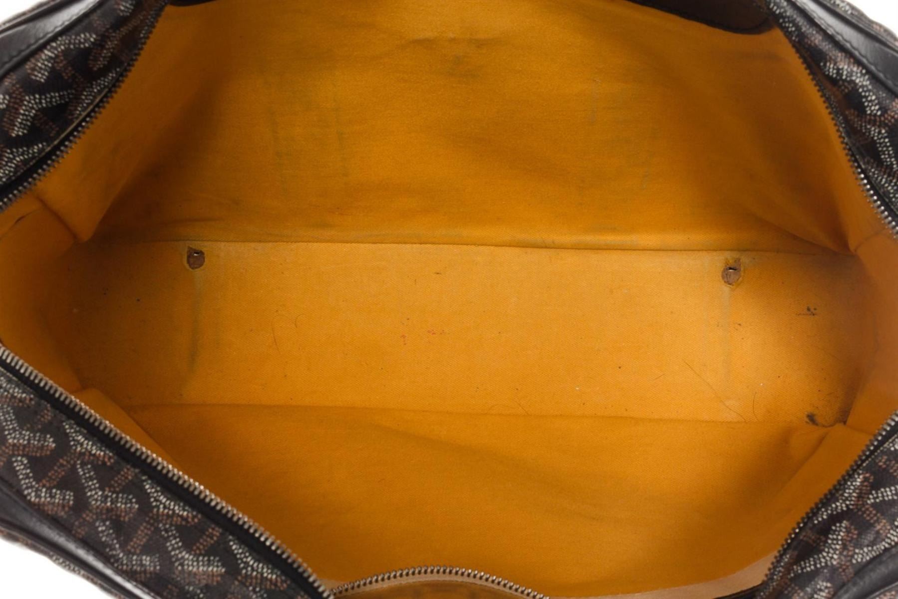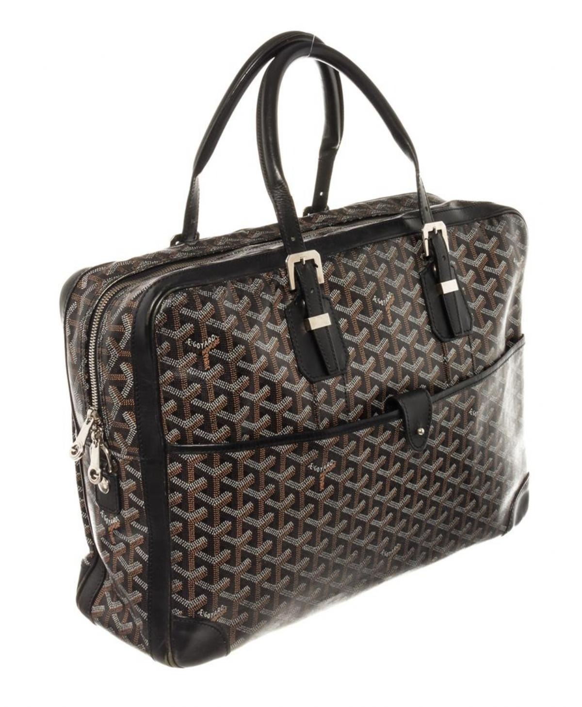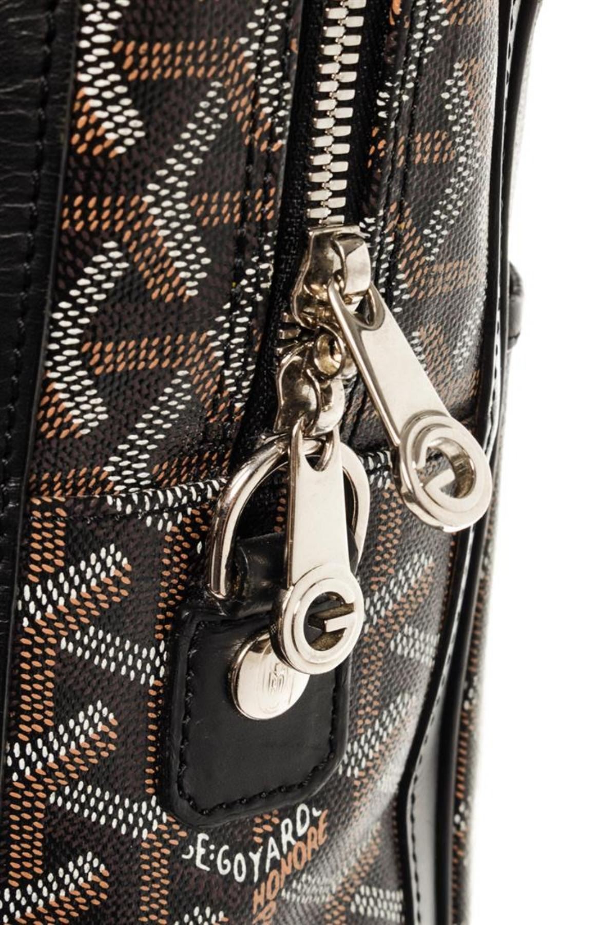 Black Goyardine Chevron monogram Goyard Ambassade MM briefcase features dual rolled leather top handles with silver-tone buckles, a facing patch pocket, and leather trim. The wrap around zipper opens to a mango yellow fabric interior with pockets. Leng