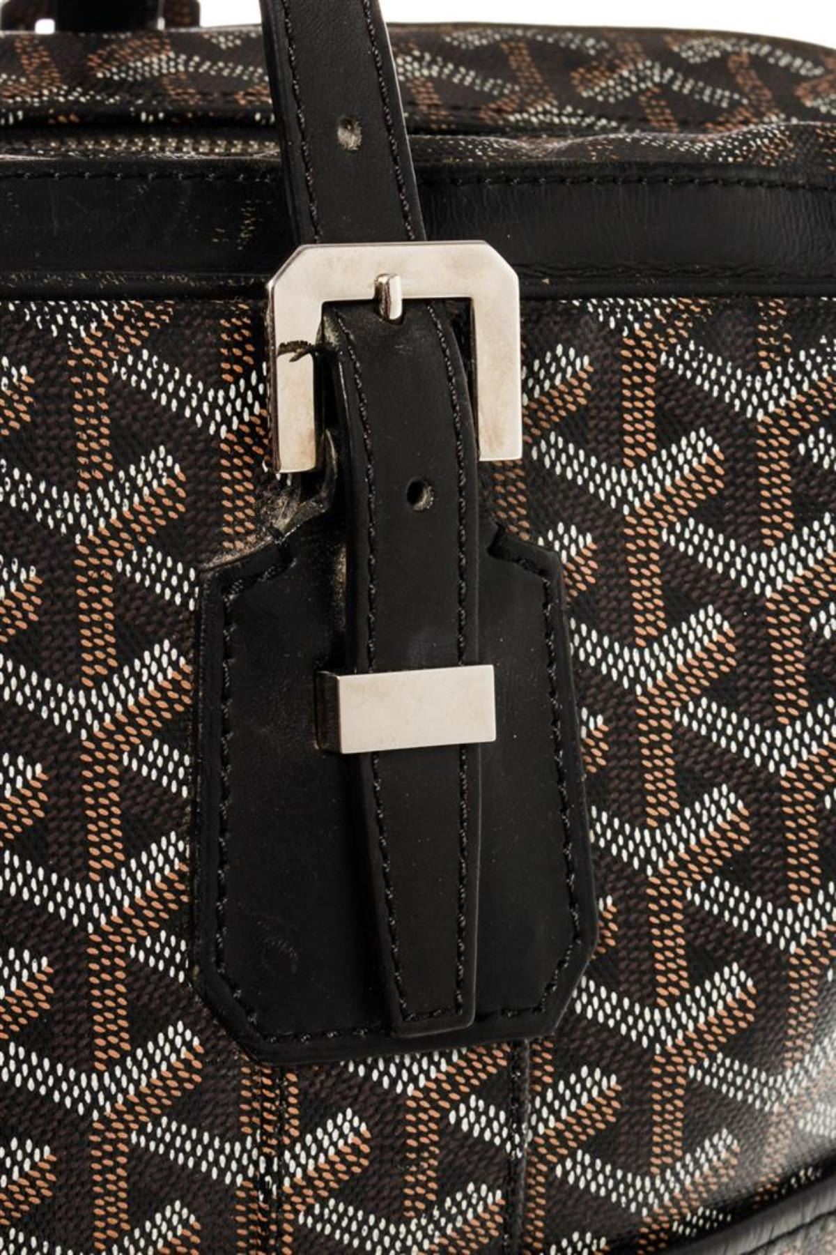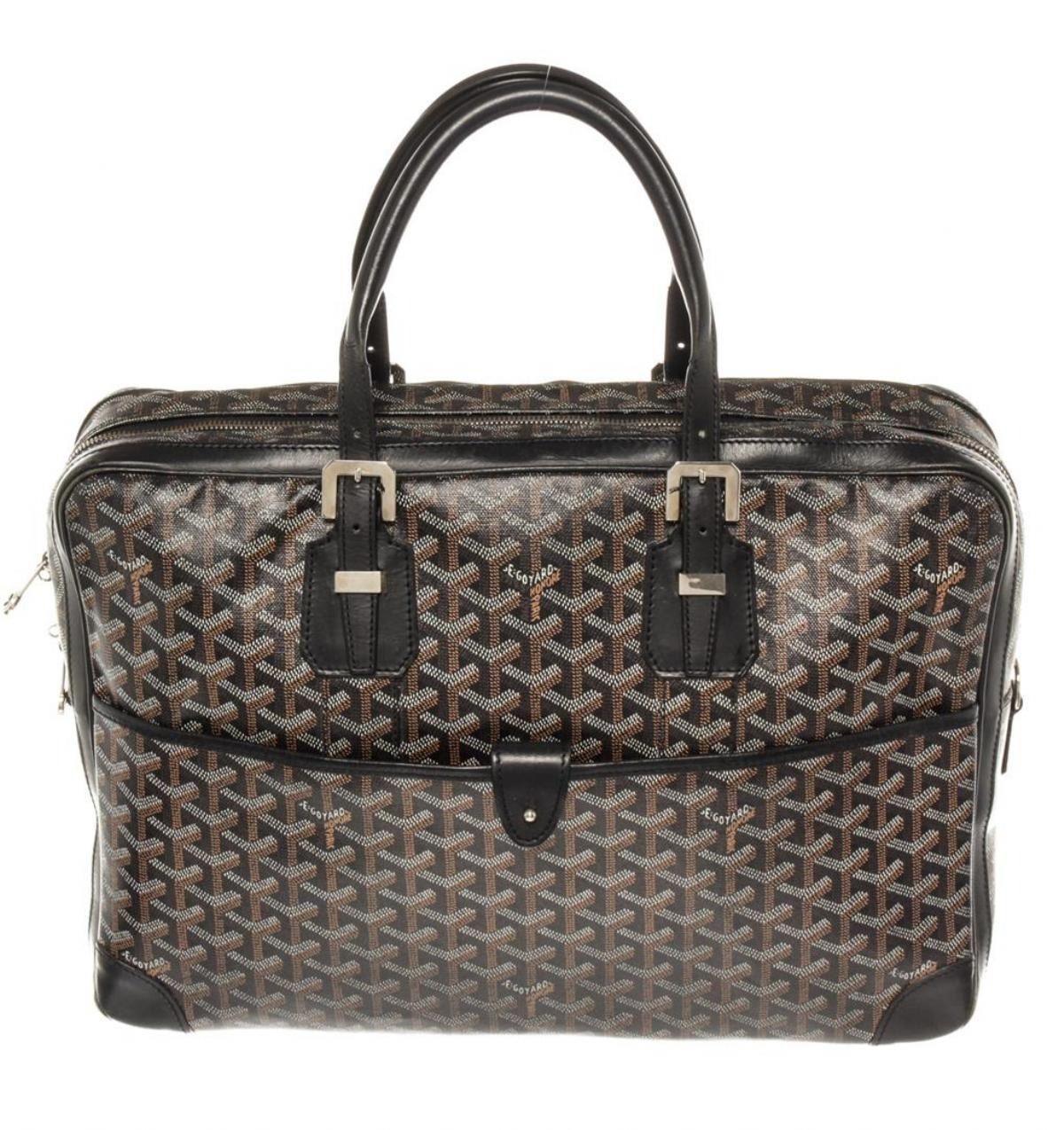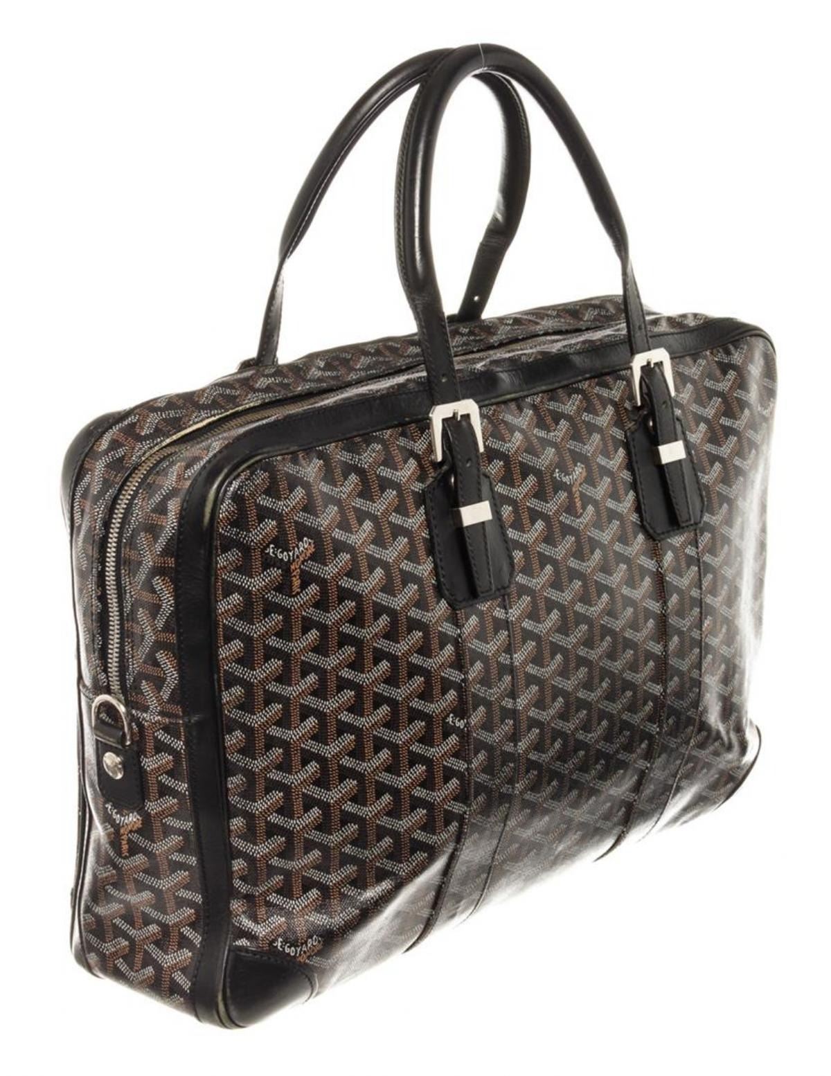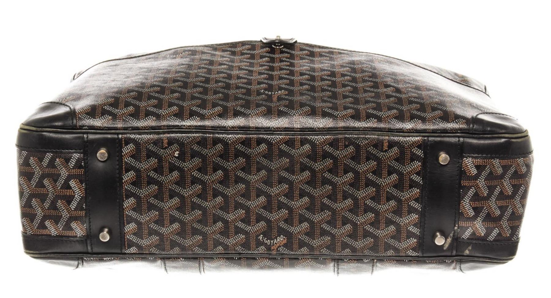 Black Goyardine Chevron monogram Goyard Ambassade MM briefcase features dual rolled leather top handles with silver-tone buckles, a facing patch pocket, and leather trim. The wrap around zipper opens to a mango yellow fabric interior with pockets. Leng