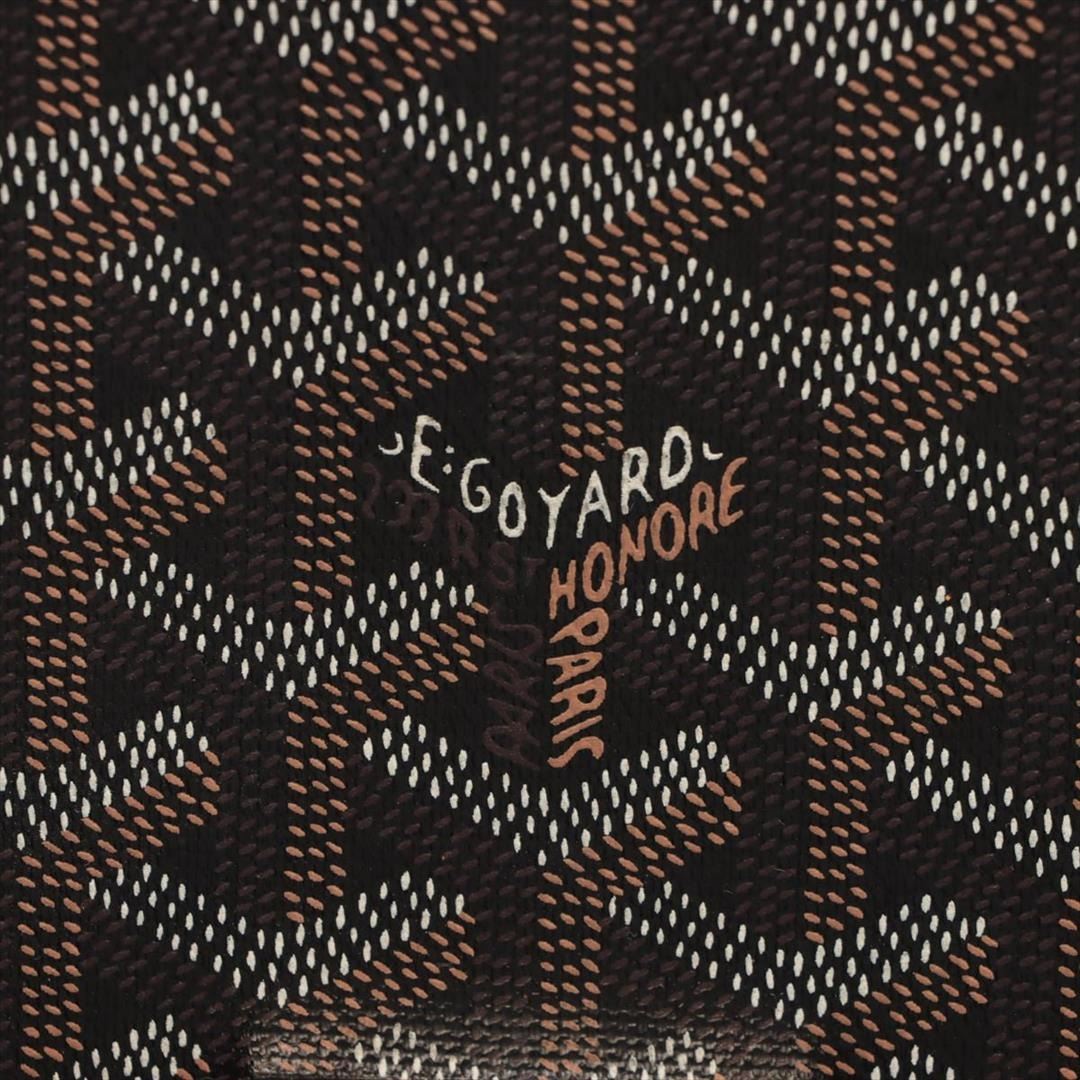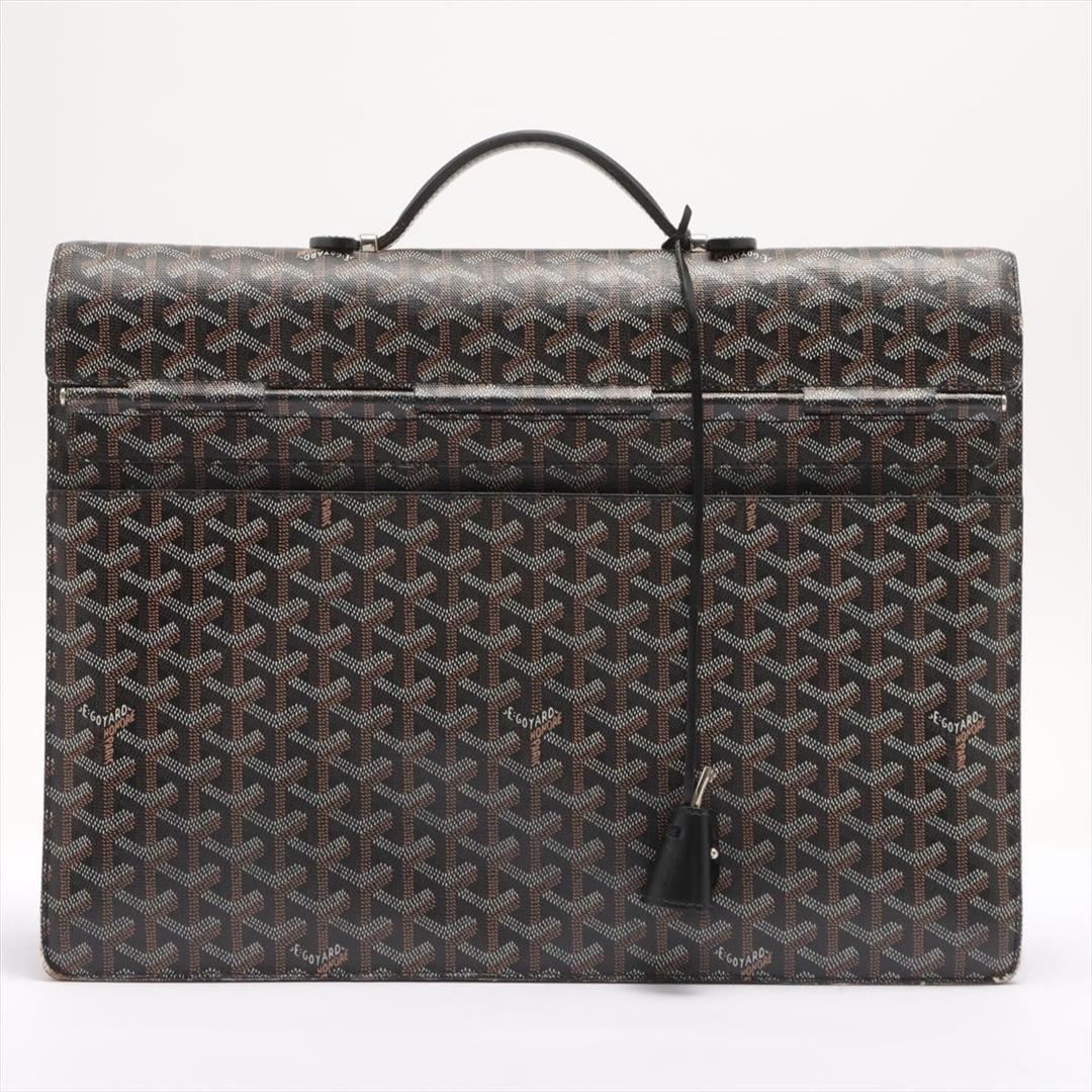 One Goyard Black Goyardine Coated Canvas Chypre Deux Soufflets Briefcase Bag. Item is sold AS-IS. All available information is listed in the description and shown in the photo. Men's black, brown and white stenciled Goyardine coated canvas Goyard Chypre Deux Soufflets briefcase with palladium hardware, black leather trim, single rolled top handle, slit pocket at back, marigold leather lining, three compartments; one featuring zip closure and push-lock closure at front flap. Height: 12" Width: 16" Depth: 3.75" Handle Drop: 2"