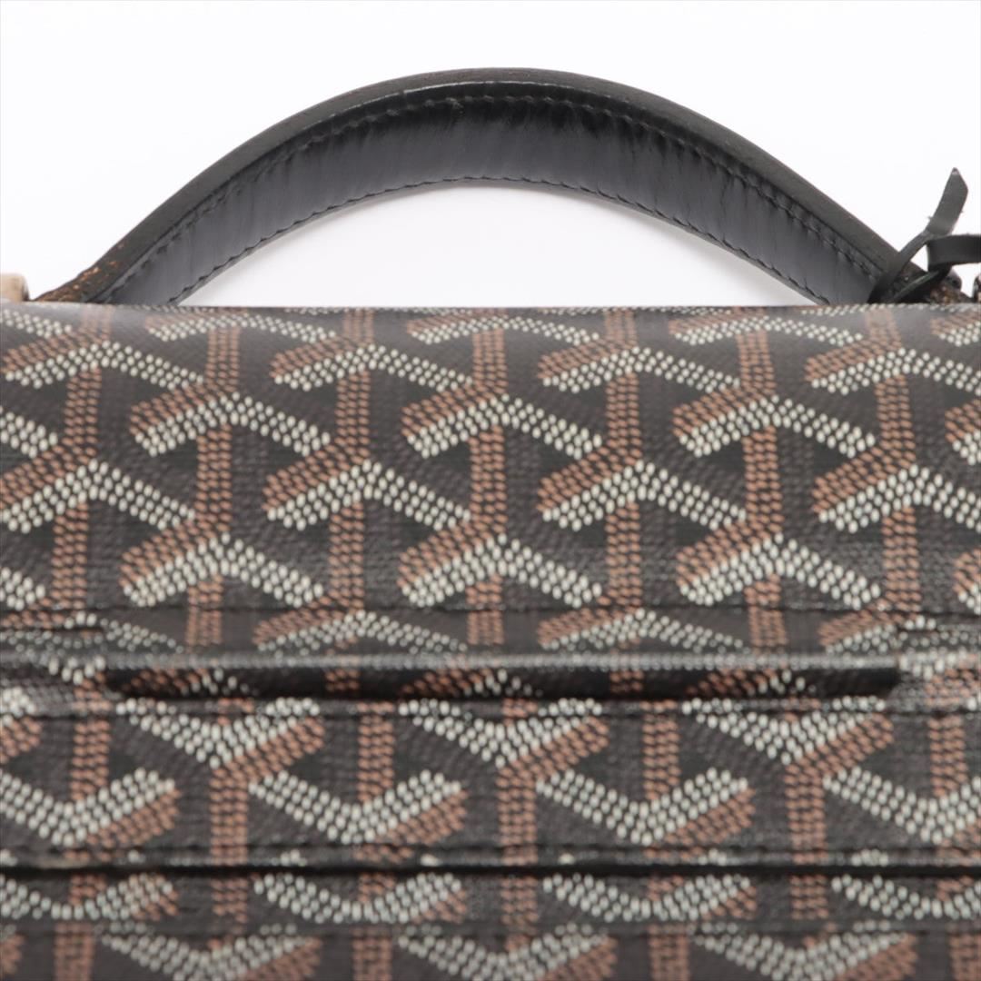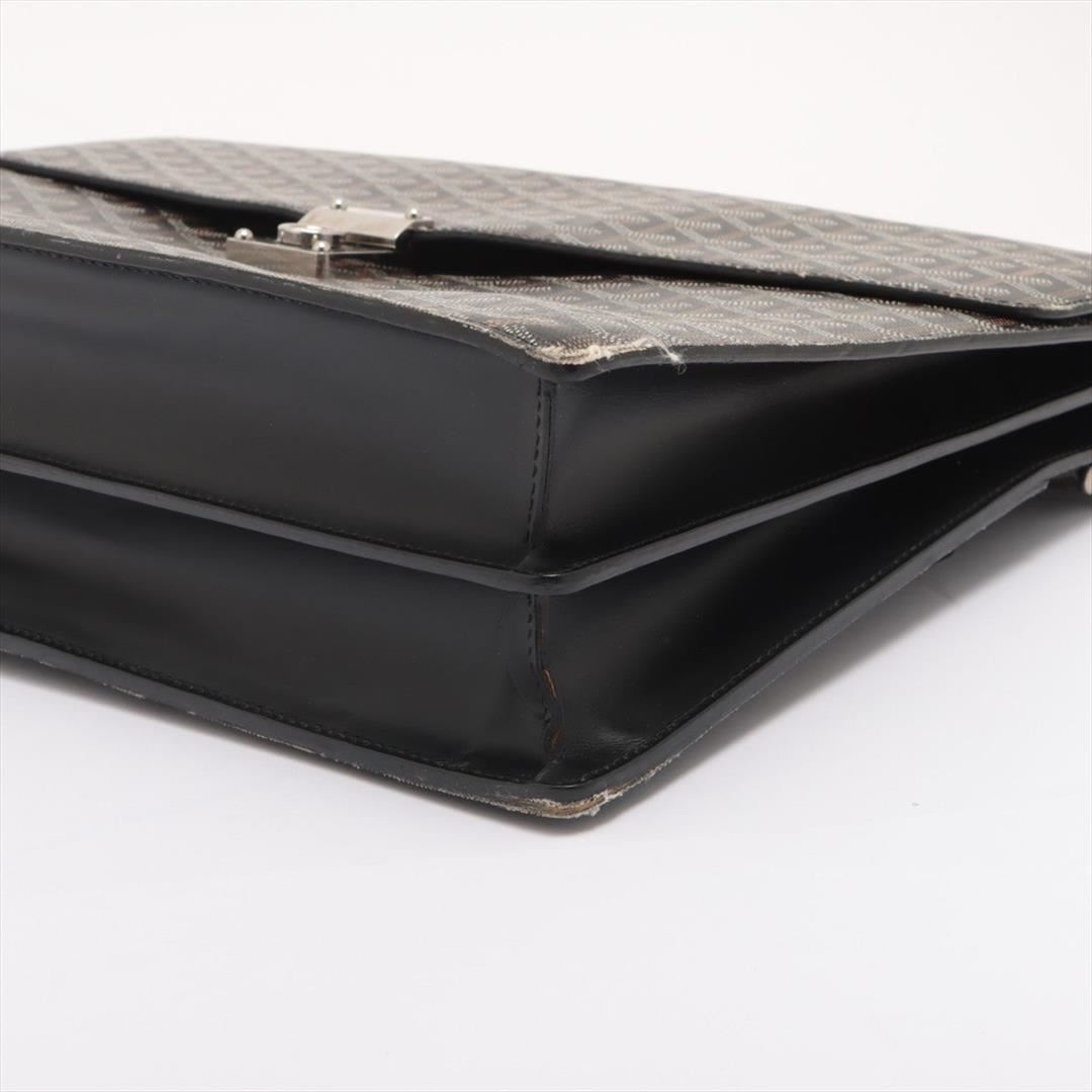 One Goyard Black Goyardine Coated Canvas Chypre Deux Soufflets Briefcase Bag. Item is sold AS-IS. All available information is listed in the description and shown in the photo. Men's black, brown and white stenciled Goyardine coated canvas Goyard Chypre Deux Soufflets briefcase with palladium hardware, black leather trim, single rolled top handle, slit pocket at back, marigold leather lining, three compartments; one featuring zip closure and push-lock closure at front flap. Height: 12" Width: 16" Depth: 3.75" Handle Drop: 2"