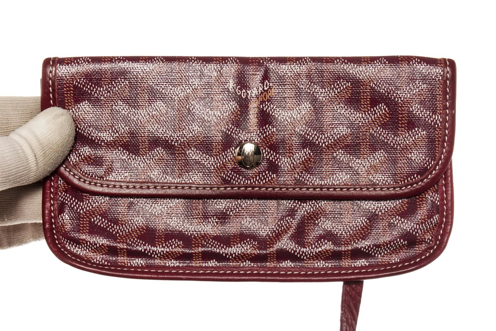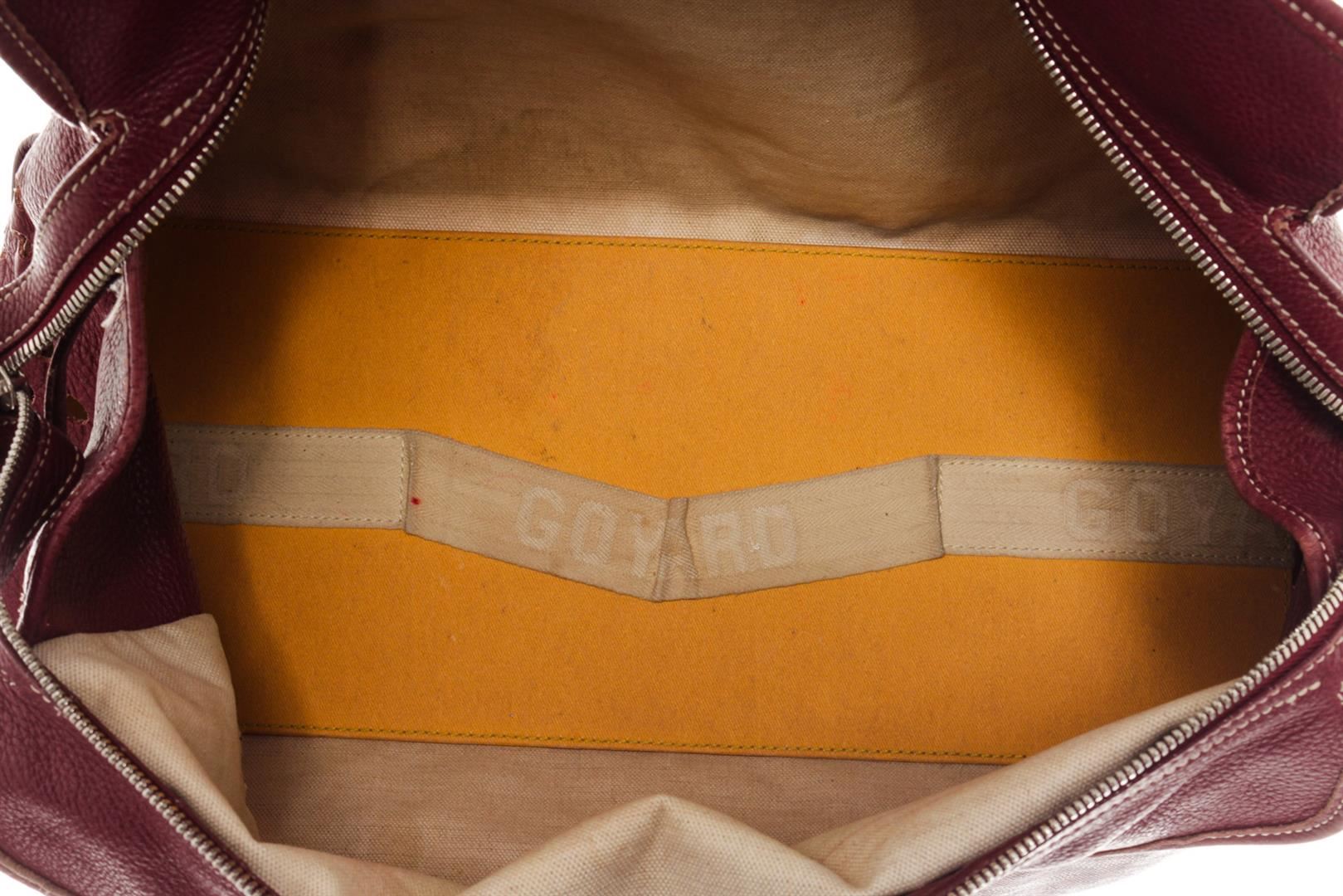 One Goyard Burgundy Goyardine Canvas Leather Sac Hardy PM Tote Bag. Item is sold AS-IS. Please check photos and descriptions for all available details. Burgundy Goyardine coated canvas Goyard Sac Hardy PM tote bag with silver-tone hardware, dual shoulder straps, perforated details, small pouch with stud closure, beige canvas lining and zip closure at top. Height: 12" Width: 16" Depth: 6.5" Shoulder Strap Drop: 7.5"