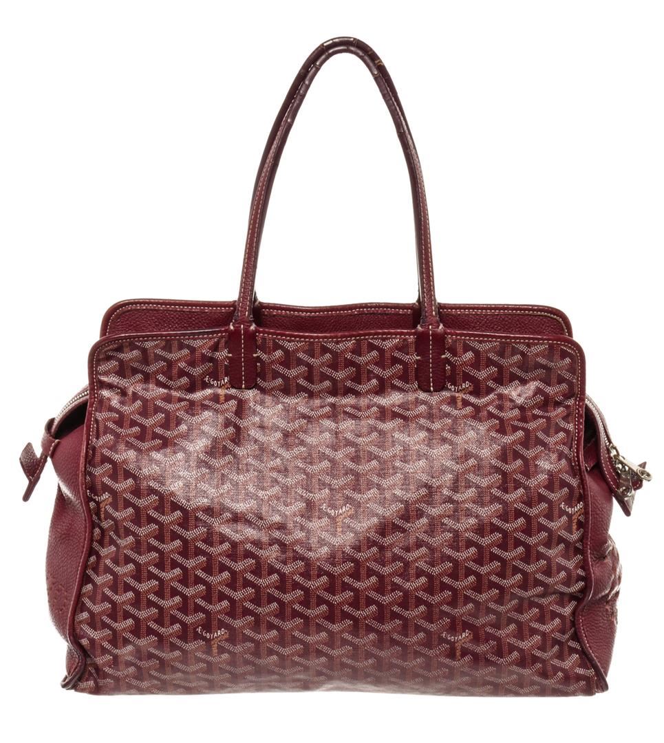 One Goyard Burgundy Goyardine Canvas Leather Sac Hardy PM Tote Bag. Item is sold AS-IS. All available information is listed in the description and shown in the photo. Burgundy Goyardine coated canvas Goyard Sac Hardy PM tote bag with silver-tone hardware, dual shoulder straps, perforated details, small pouch with stud closure, beige canvas lining and zip closure at top. Height: 12" Width: 16" Depth: 6.5" Shoulder Strap Drop: 7.5"