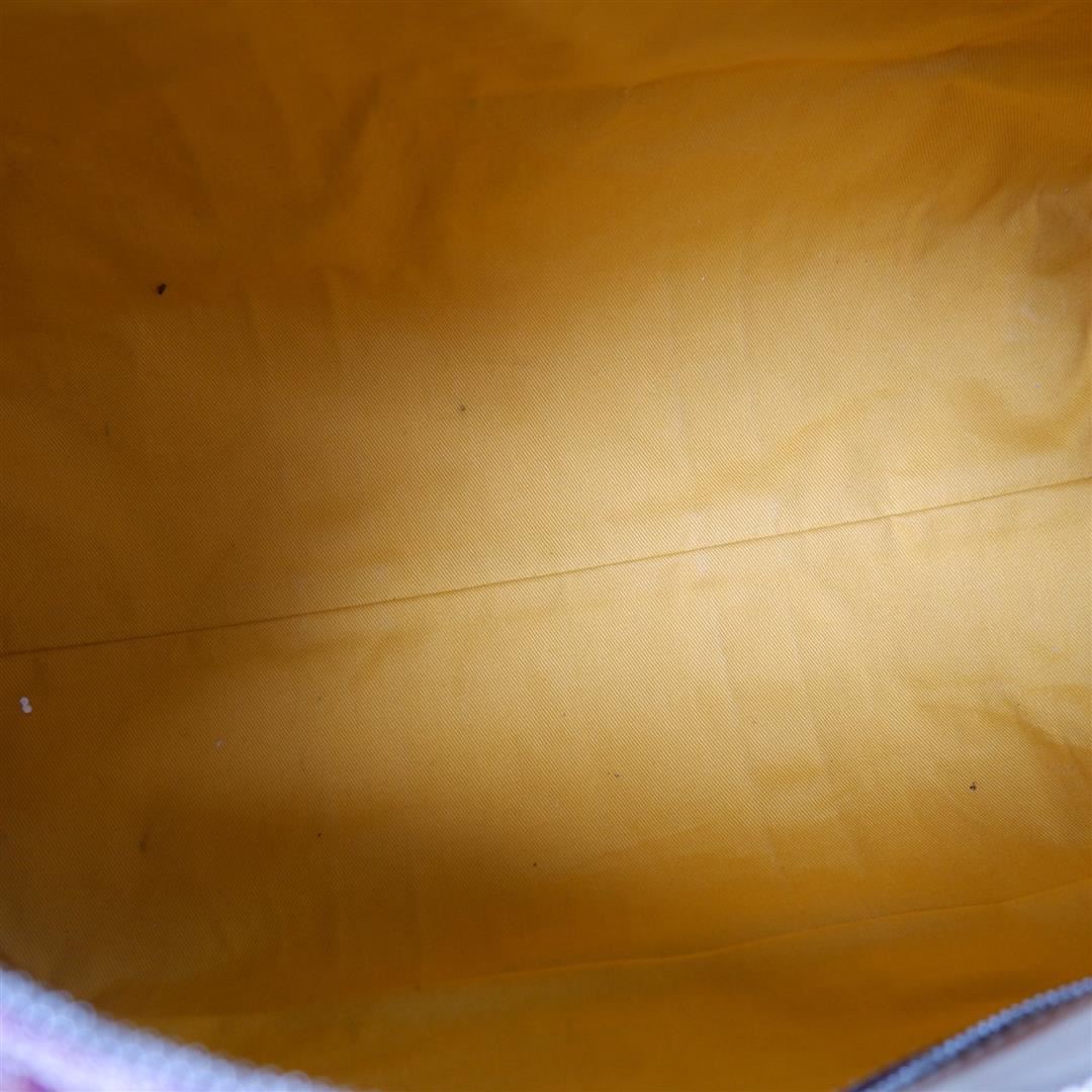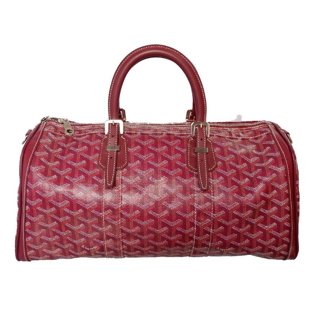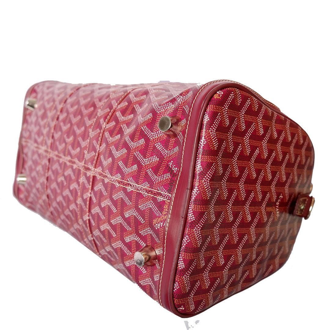 Red and multicolor hand-painted Goyardine coated canvas Goyard Croisiere 35 with silver-tone hardware, feet at base, tonal cowhide leather trim, tonal stitching, dual rolled top handles, marigold woven lining, single zip pocket at interior wall and two-wa