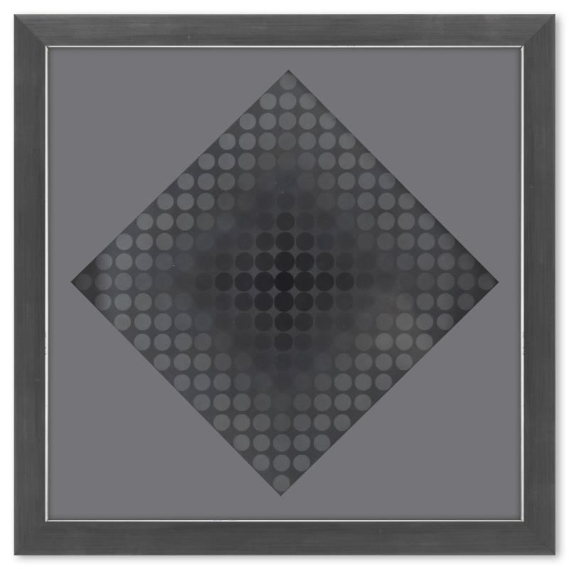 "Goyo - SZ et Goyo - EZ de la serie CTA - 102 (Diptych)" is a set of heliogravure prints on paper published in 1971 by Victor Vasarely (1908-1997). These pieces come custom framed with a letter of authenticity and with a 1976 Vasarely paperback. Measures approx. 11.5" x 11.5" (frame) 9" x 9" (image).