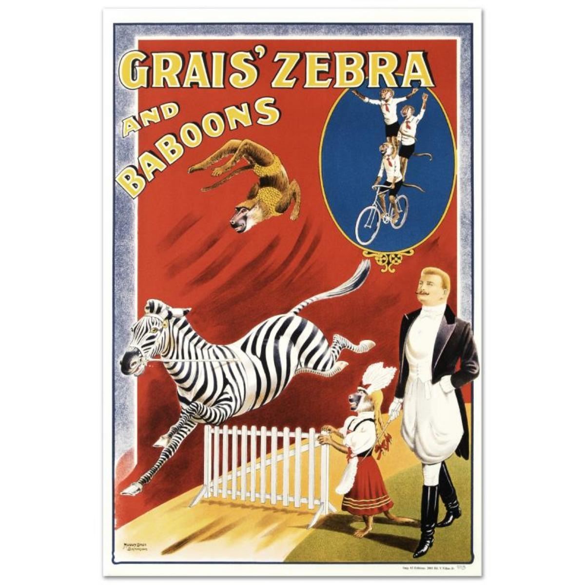 Grais Zebra & Baboons by RE Society. "Grais Zebra and Baboons" is a hand pulled lithograph on paper by the RE Society, image originally by Albert Whitfield. Includes letter of authenticity. Measures approx. 20" x 30" (with border), 19" x 28.5" (image).