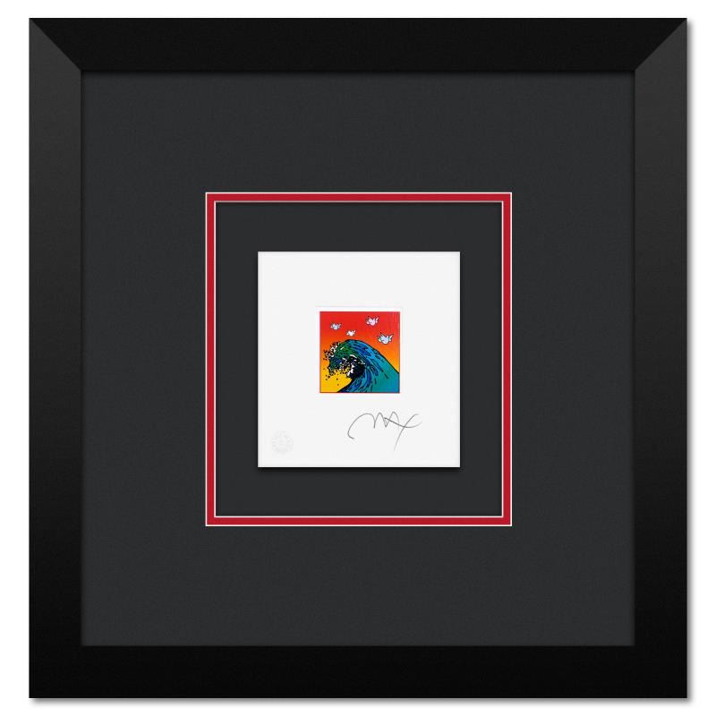 "Great Wave with Doves" is a limited edition lithograph on paper by Peter Max, numbered and hand signed by the artist. This piece comes framed. Includes Certificate of Authenticity from Peter Max Studios. Measures approx. 15" x 14.5" (frame), 5" x 4.5" (image).