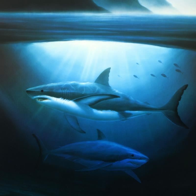 "Great White Sharks" is a limited edition lithograph on paper by Wyland, hand signed by the artist. Includes Letter of Authenticity. Measure approx. 35" x 24" (border), 27.5" x 20.5" (image).