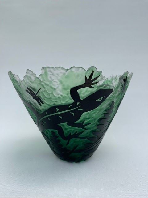 Hand-blown and sculpted glass bowl 10.5 inches wide, 7.5 inches tall. Etched signed by Gustavo Santana/Santana Art Glass.
