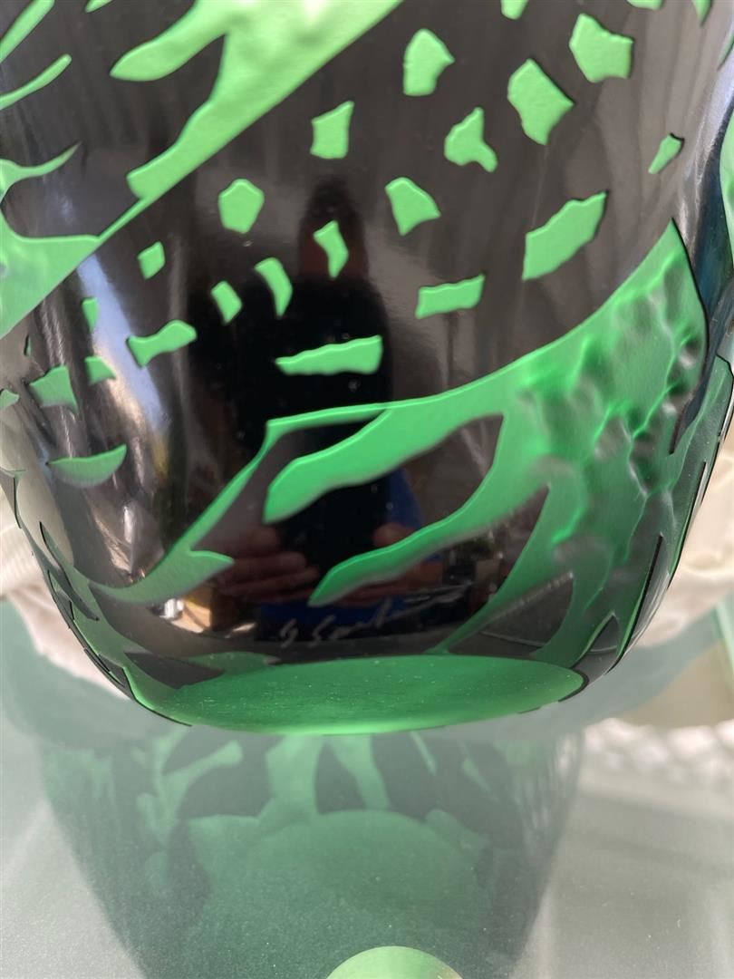 Hand-blown and sculpted glass bowl 10.5 inches wide, 7.5 inches tall. Etched signed by Gustavo Santana/Santana Art Glass.