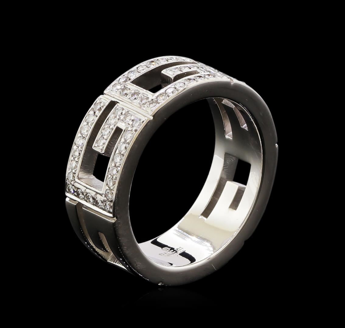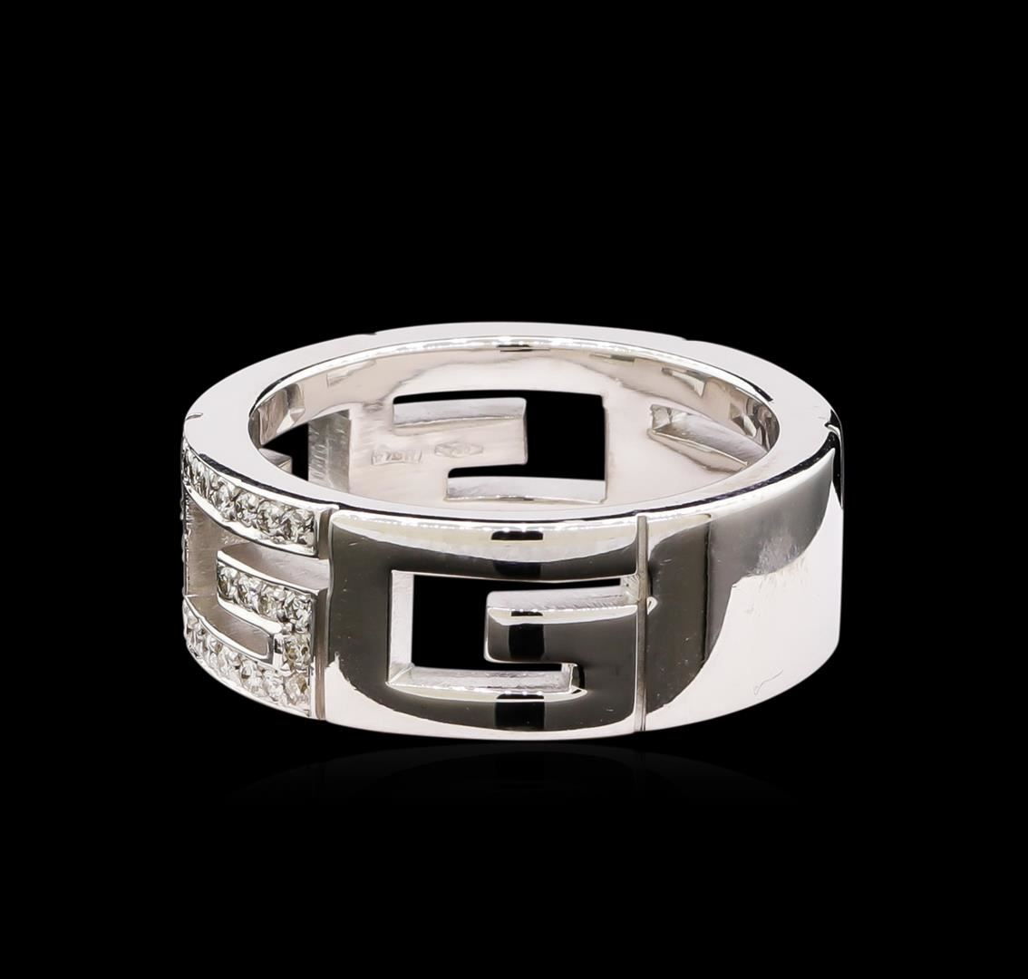 One electronically tested 18KT white gold ladies cast diamond ring with a bright polish finish. The seven millimeter wide ring features Gucci's recognizable ornamentation of three diamond pav‚ set geometric "G" panels and two polished "G" panels. Ring size 7. Trademark is GUCCI. Identified with markings of "750". Condition is good. Containing: Seventy-Two pave' set round brilliant cut diamonds, measuring 1.10 - 1.10 x 0.66mm (depth est.) approximate total weight of 72 Stones = 0.44ct. Graded in the setting. Clarity: VS-1 to VS-2. Color: F - G. Total Weight of Diamonds 0.44ct. Total Weight of Ring 10.72gm. AIG Appraised at $2,090.00.