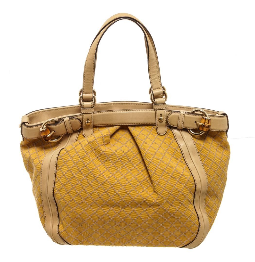 Gucci Bamboo/Diamante handbag yellow, beige canvas and leather. Brand: Gucci, Style: Bamboo/Diamante, Type: handbag, Exterior Color: yellow, beige, Exterior Material: canvas and leather, Exterior Pockets: None, Interior Color: off white, Interior Material: fabric, Interior Pockets: three, Closure: zip, Handle/Strap Type: dual leather top handle, Length: 16 1/2, Width: 7 1/2, Height: 1N/A 1/2, Handle Drop: 6 3/4. Condition: overall minimal wear. Additional Information: gold hardware. Item is sold AS-IS and all information pertaining to this lot is available in the photos or this description.