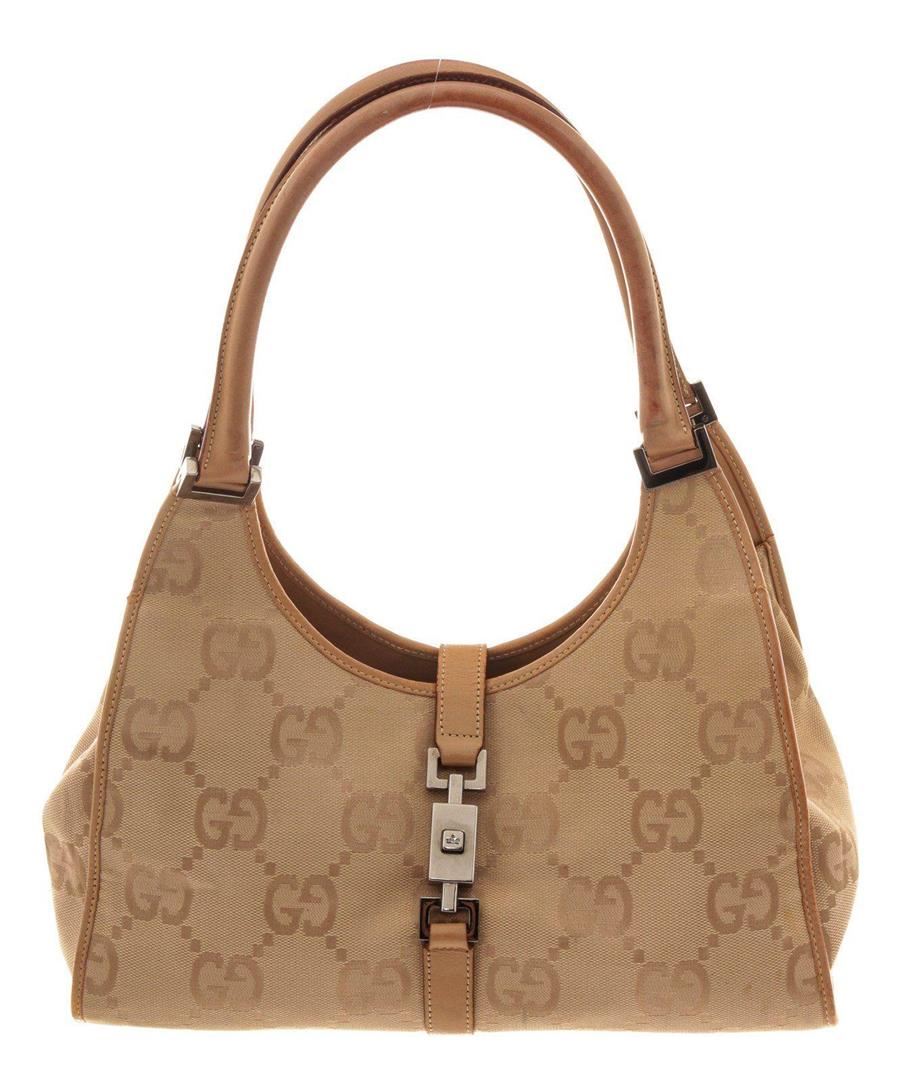 Gucci Begie Tan GG Canvas Leather Jackie Shoulder Bag with material canvas, gold-tone hardware, interior slip pocket, dula top handle and push lock closure.