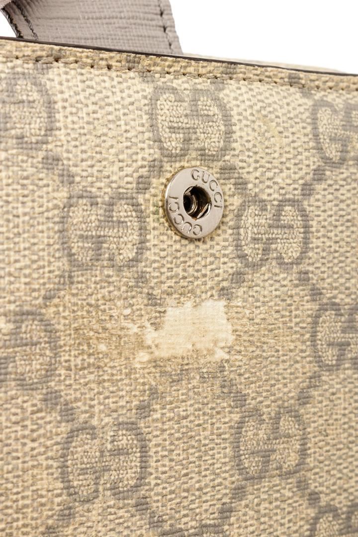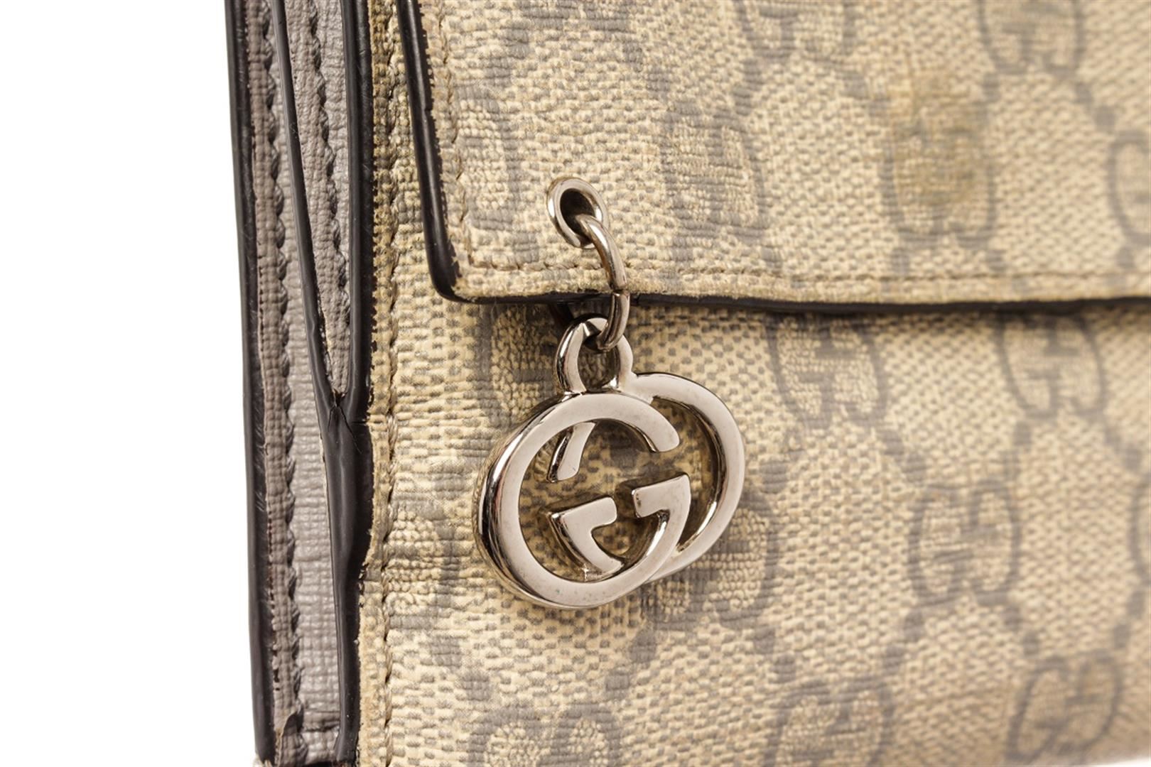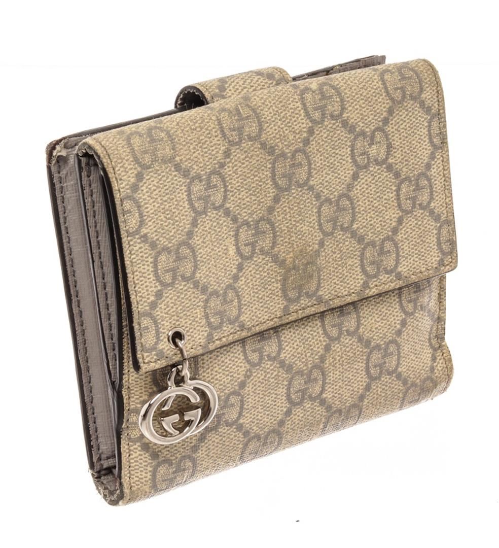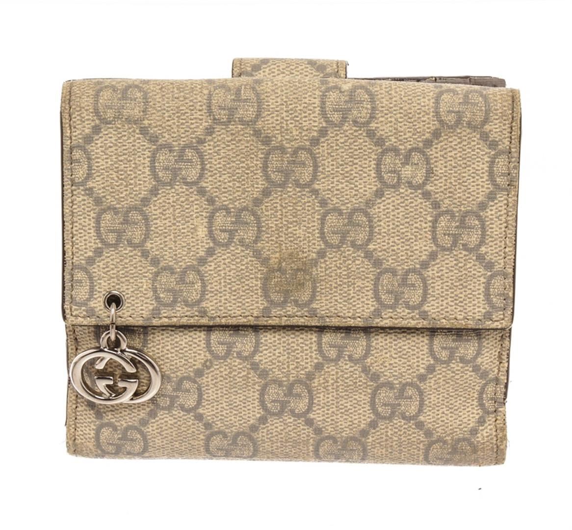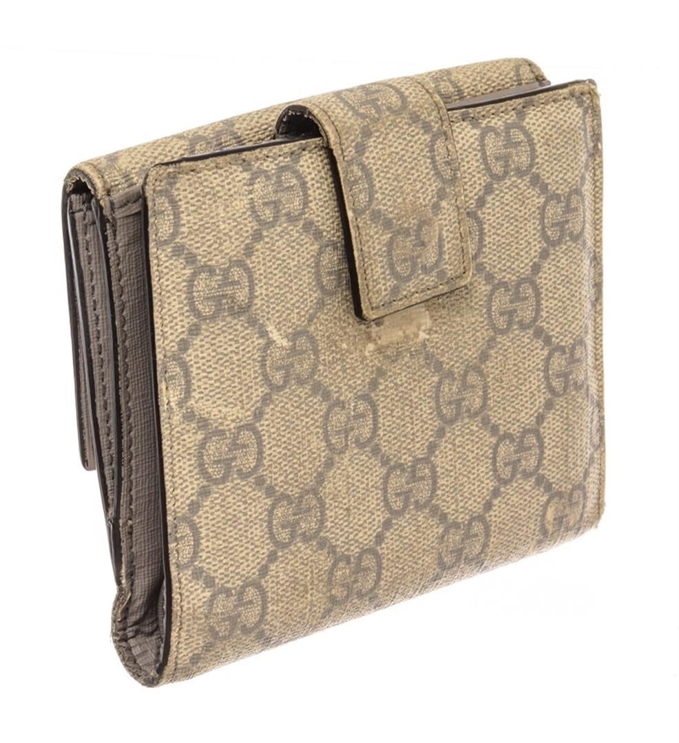 Gucci Beige Canvas Leather GG Suprme Compact Tab Wallet. All available information is listed in the description and shown in the photos. gucci beige canvas leather gg suprme compact tab wallet with odor in interior. splitting and cracking on base and opening corner wax edges, creasing near base, peeling on interior side edge. small mark on interior pocket, scratches on hardware. 5"W x 4"H x 1"D, / 12.7 x 10.16 x 2.54 Cm