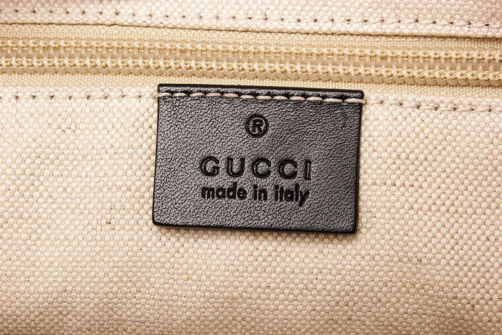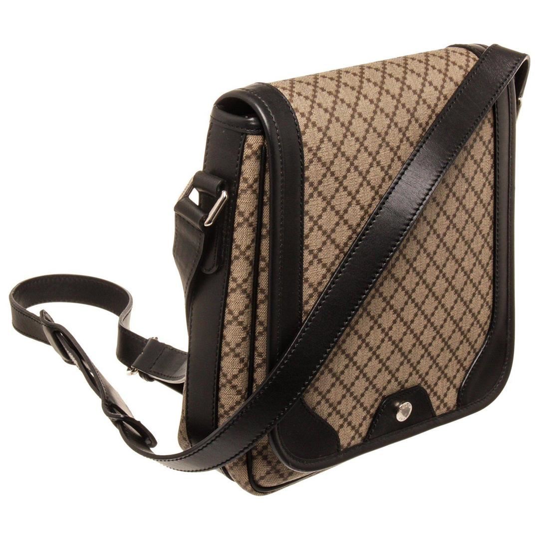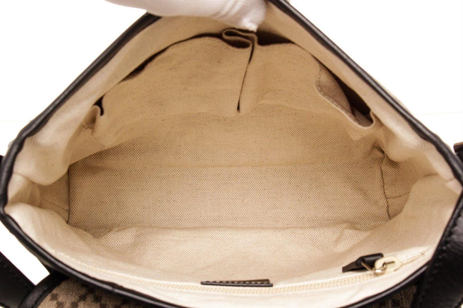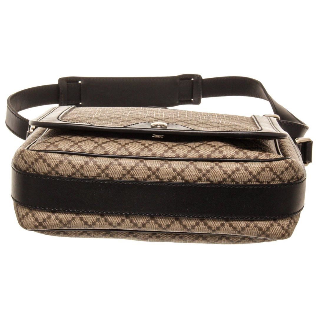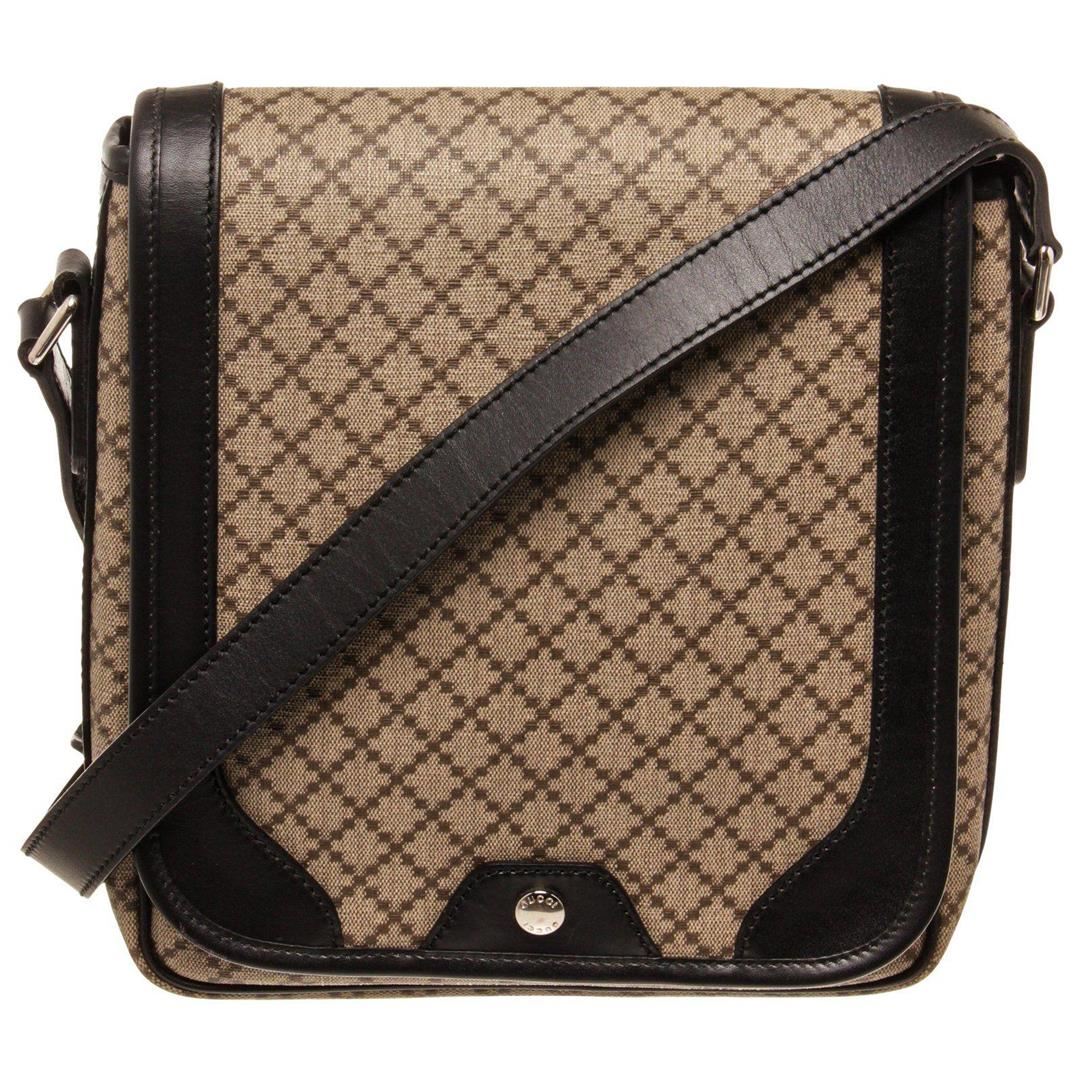Gucci Beige Canvas Leather Snap Flap Messenger Bag with canvas leather, gold-tone hardware, tan leather accents, adjustable flat shoulder strap, brown woven lining, single pocket at interior wall and magnetic snap closure at front flap.