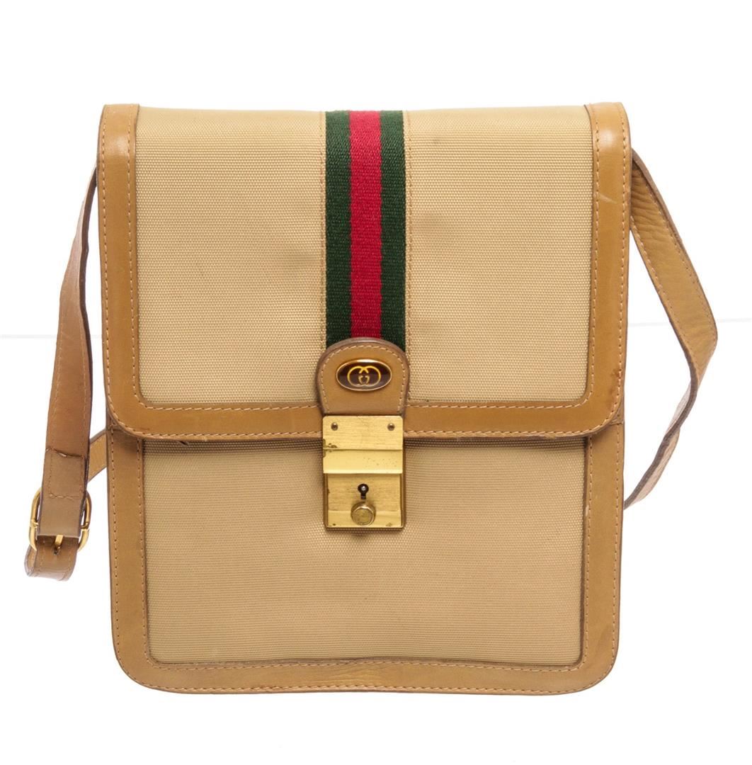 Gucci Beige Canvas Sherry Shoulder Bag with gold-tone hardware, beige leather trim, exterior flap pockets, interior flap pockets, canvas lining, top handle, leather shoulder strap, and flap closure. Condition: Pre-Owned Good overall, please see phot