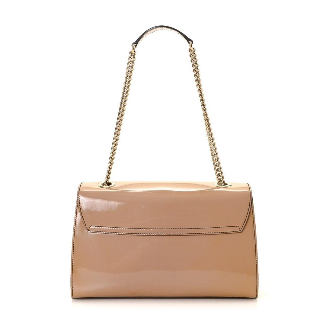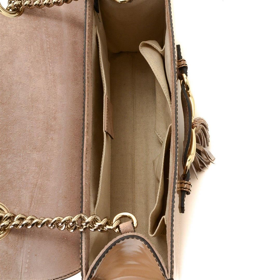 Gucci Beige Leather Horsebit Shoulder Bag with gold-tone hardware, single convertible chain-link strap with dual flat leather shoulder guards, creme canvas lining, single interior slit pocket and tassel-accented Horsebit fold-in-flap closure at face. Measurements: Length: 3 in / 8 cm Width: 10 in / 25 cm 7 in / 18 cm Condition: Pre-Owned Good overall, please see photographs for detail.