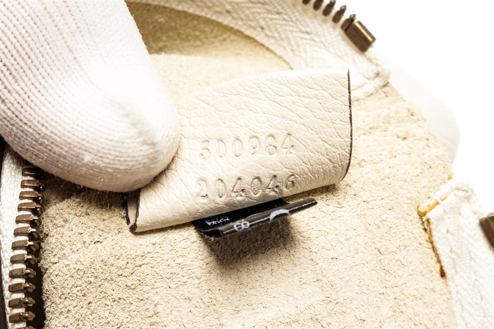 One Gucci Beige Leather Logo Print Clutch. Item is sold AS-IS. All available information is listed in the description and shown in the photo. Gucci beige leather logo print clutch with beige suede lining, gold hardware, and zipper closure.
