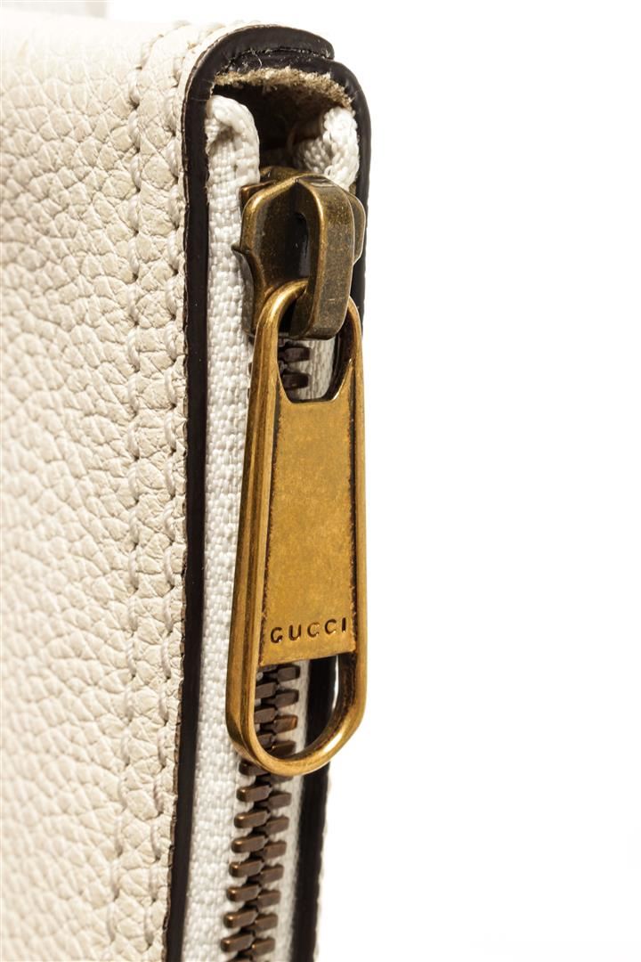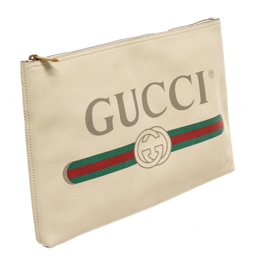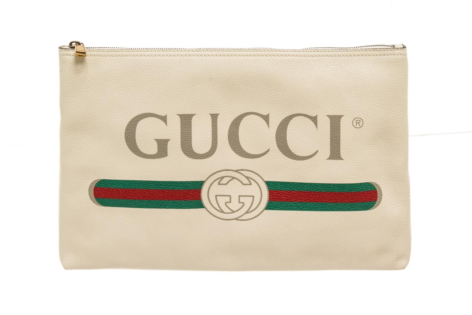 One Gucci Beige Leather Logo Print Clutch. Item is sold AS-IS. All available information is listed in the description and shown in the photo. Gucci beige leather logo print clutch with beige suede lining, gold hardware, and zipper closure.