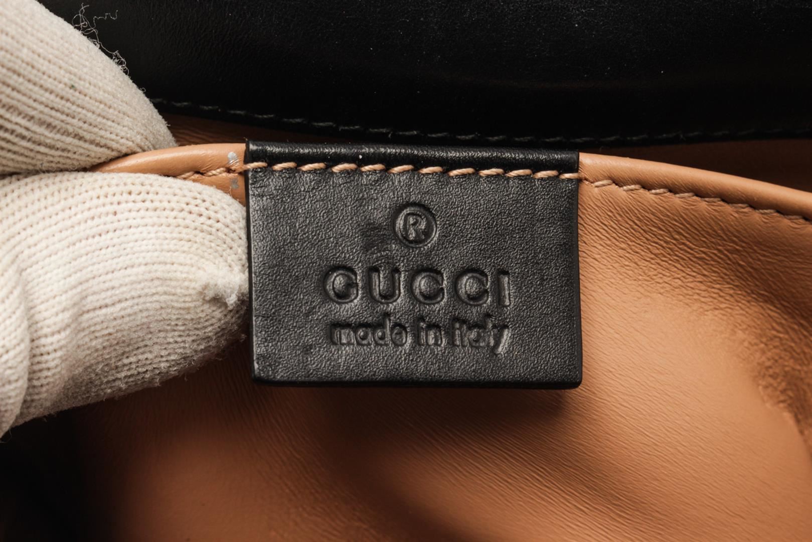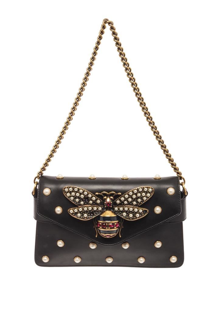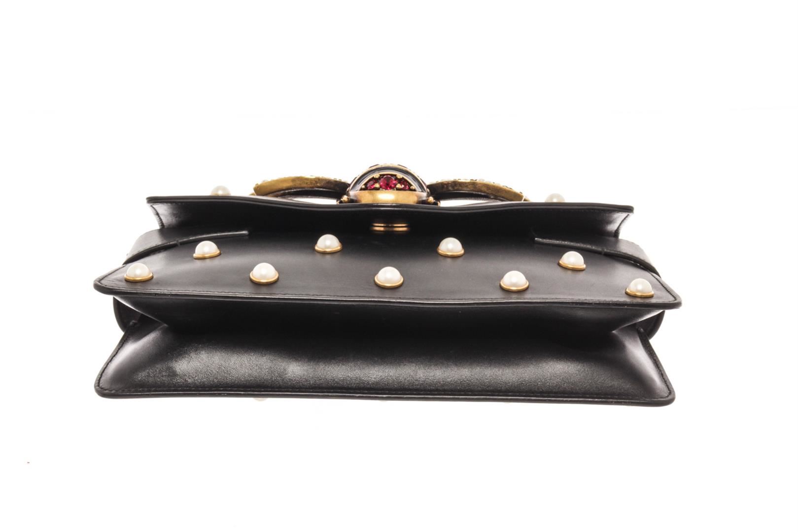 Gucci Black Calfskin Leather Broadway Shoulder Bag. All available information is listed in the description and shown in the photos. Gucci Black Calfskin Leather Broadway Shoulder Bag with gold chain shoulder strap, an optional red, white and blue web shoulder strap and faux pearl detailing and a gold bee motif on the flap. Please note: missing stones in the wings. length: 9.75 in, Height: 6.25 in, Width: 1.50 in / 24.76 x 15.87 x 1.50 cm