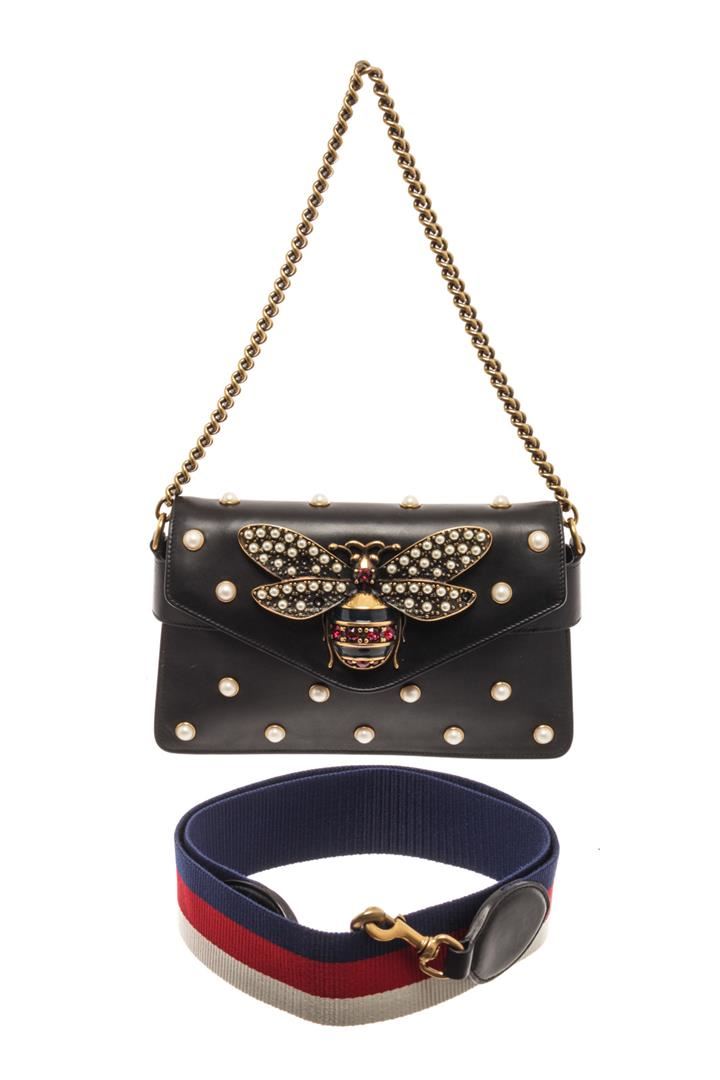 Gucci Black Calfskin Leather Broadway Shoulder Bag. All available information is listed in the description and shown in the photos. Gucci Black Calfskin Leather Broadway Shoulder Bag with gold chain shoulder strap, an optional red, white and blue web shoulder strap and faux pearl detailing and a gold bee motif on the flap. Please note: missing stones in the wings. length: 9.75 in, Height: 6.25 in, Width: 1.50 in / 24.76 x 15.87 x 1.50 cm