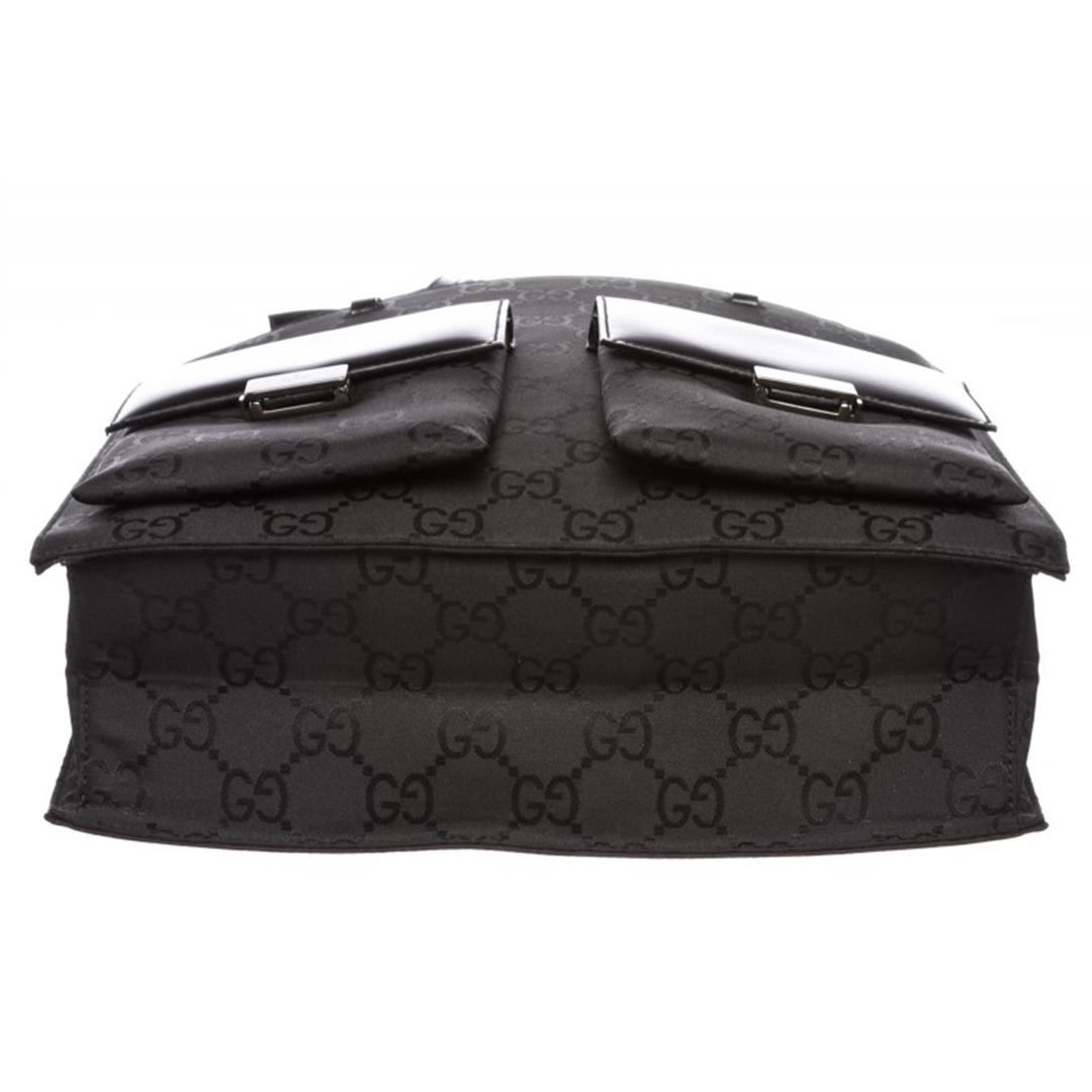 One Gucci Black Canvas Leather Monogram Double Pocket Shoulder Bag. This shoulder bag features dual flat, dual compartments with zipper pocket partition and side zipper pocket. Exterior contains dual front pockets with leather flap snap closure. Item is pre-owned.
