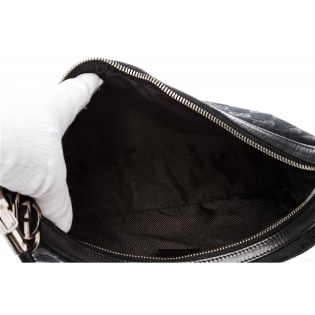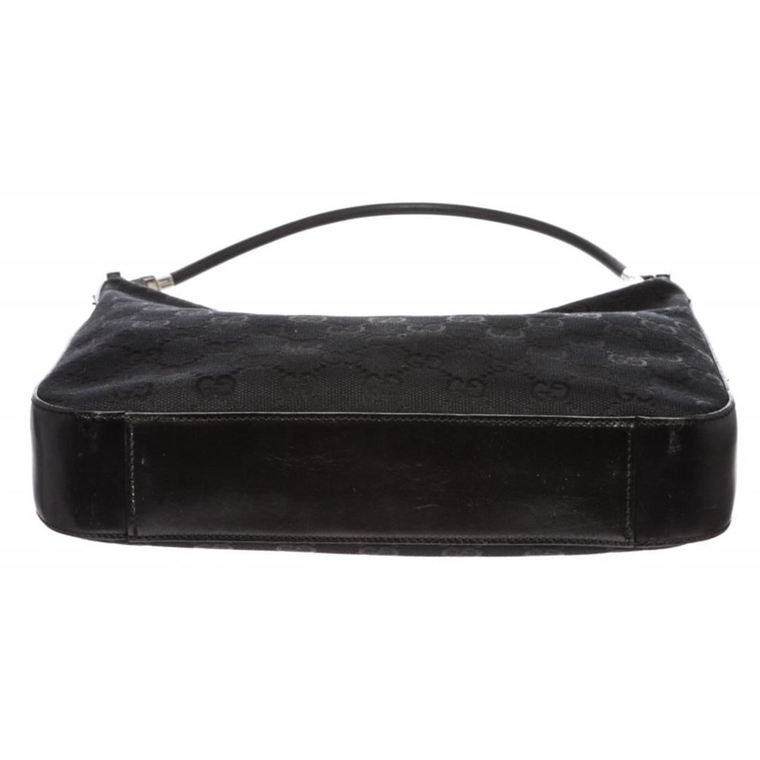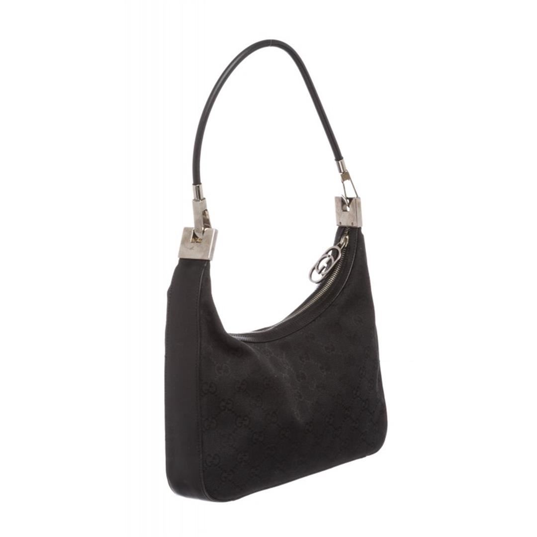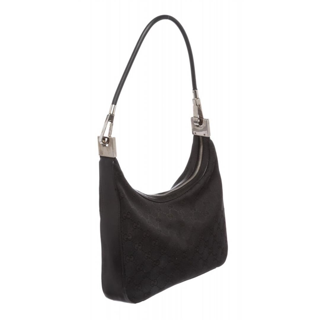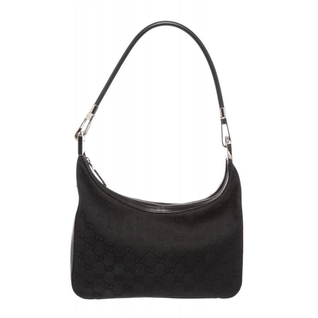 One Gucci Black Canvas Leather Monogram Shoulder Bag. Overall zipper closure. Interior is fabric lined and contains one side zipper pocket. Exterior contains leather trimming and removable single rolled leather handle.