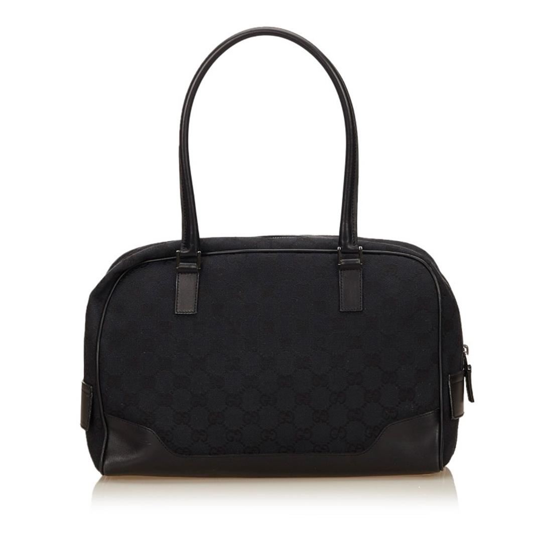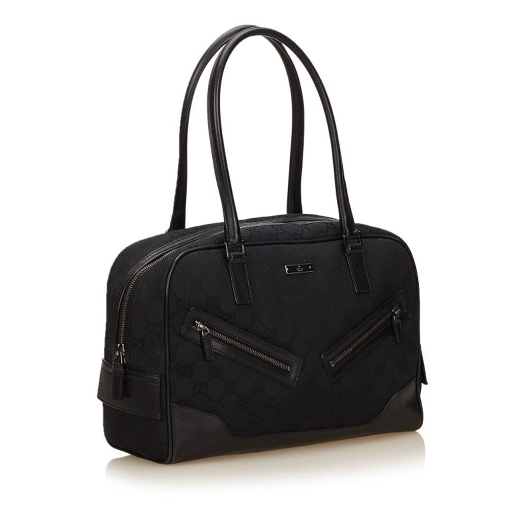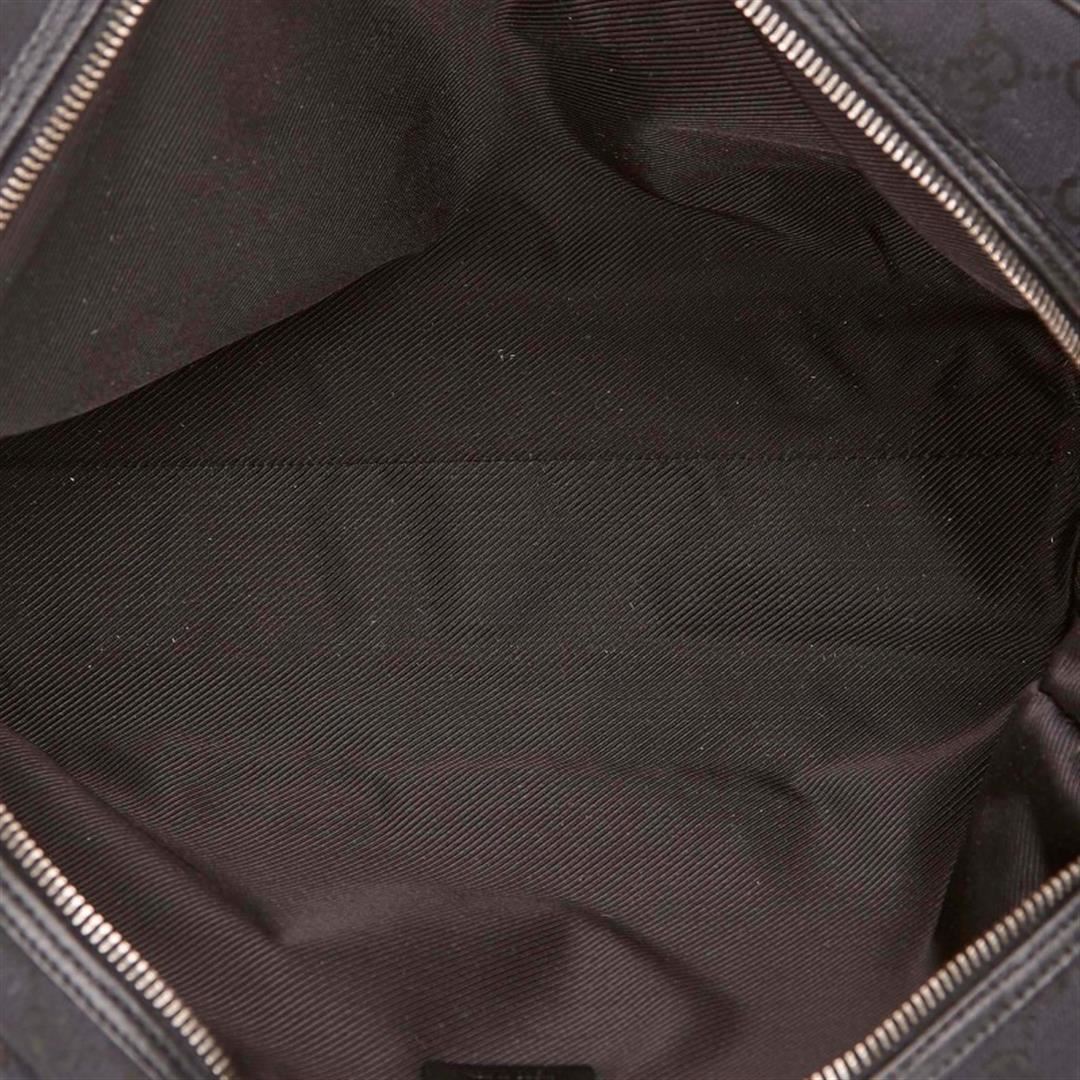 This shoulder bag features a jacquard body with leather trim, front exterior zip pockets, flat leather handle, top zip closure, and interior zip pocket. Item is pre-owned.