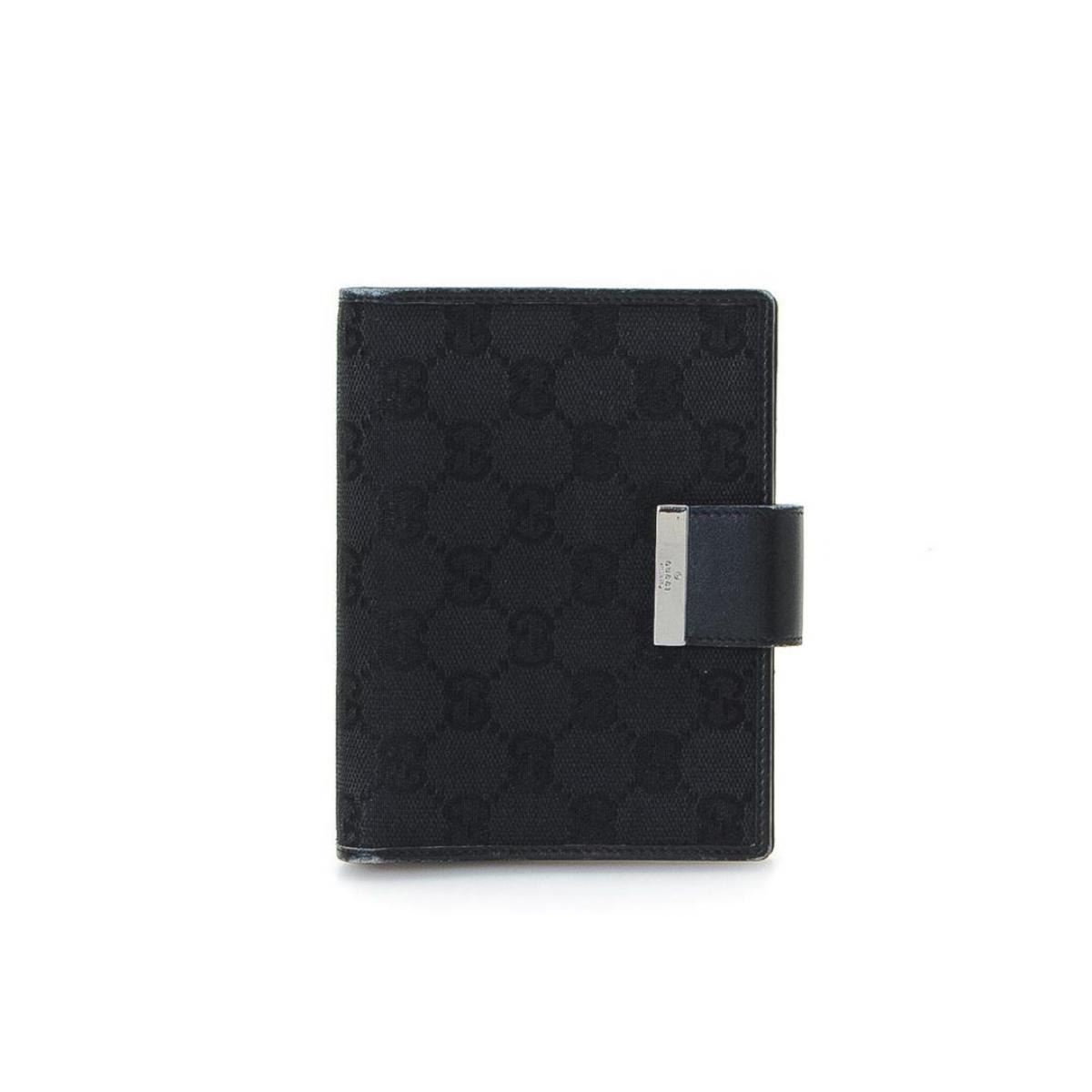 Gucci Black GG Canvas Agenda Wallet. Gucci Black GG Canvas Agenda Wallet with silver-tone hardware, interior compartments pockets, snap closure.