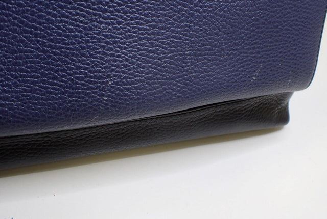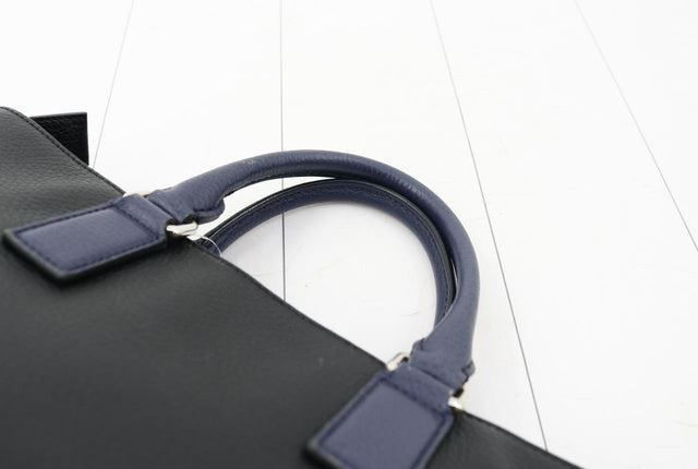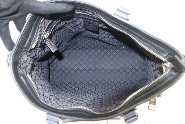 One Gucci Black Navy Blue Leather Cosmopolis Tote Bag. Item is sold AS-IS. All available information is listed in the description and shown in the photo. Bicolor black and navy blue leather Gucci Cosmopolis tote bag with silver-tone hardware, dual-rolled leather handles, front zip pocket, zip closure at top that opens to a black jacquard lining with zip and slip pockets. Handle Drop 4", Height 13.5", Width 12.5", Depth 4.5"