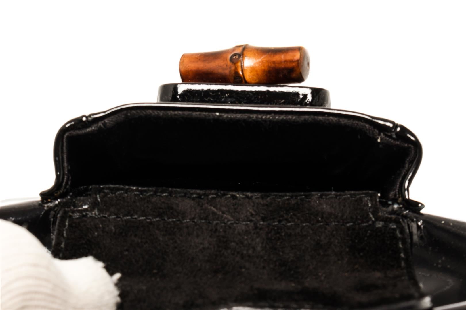 Gucci Black Patent Leather Bamboo Backpack. All available information is listed in the description and shown in the photos. Gucci Black Patent Leather Bamboo Backpack with bamboo top handle, fabric lining, silver tone hardware, exterior pocket, drawstring, snap closure