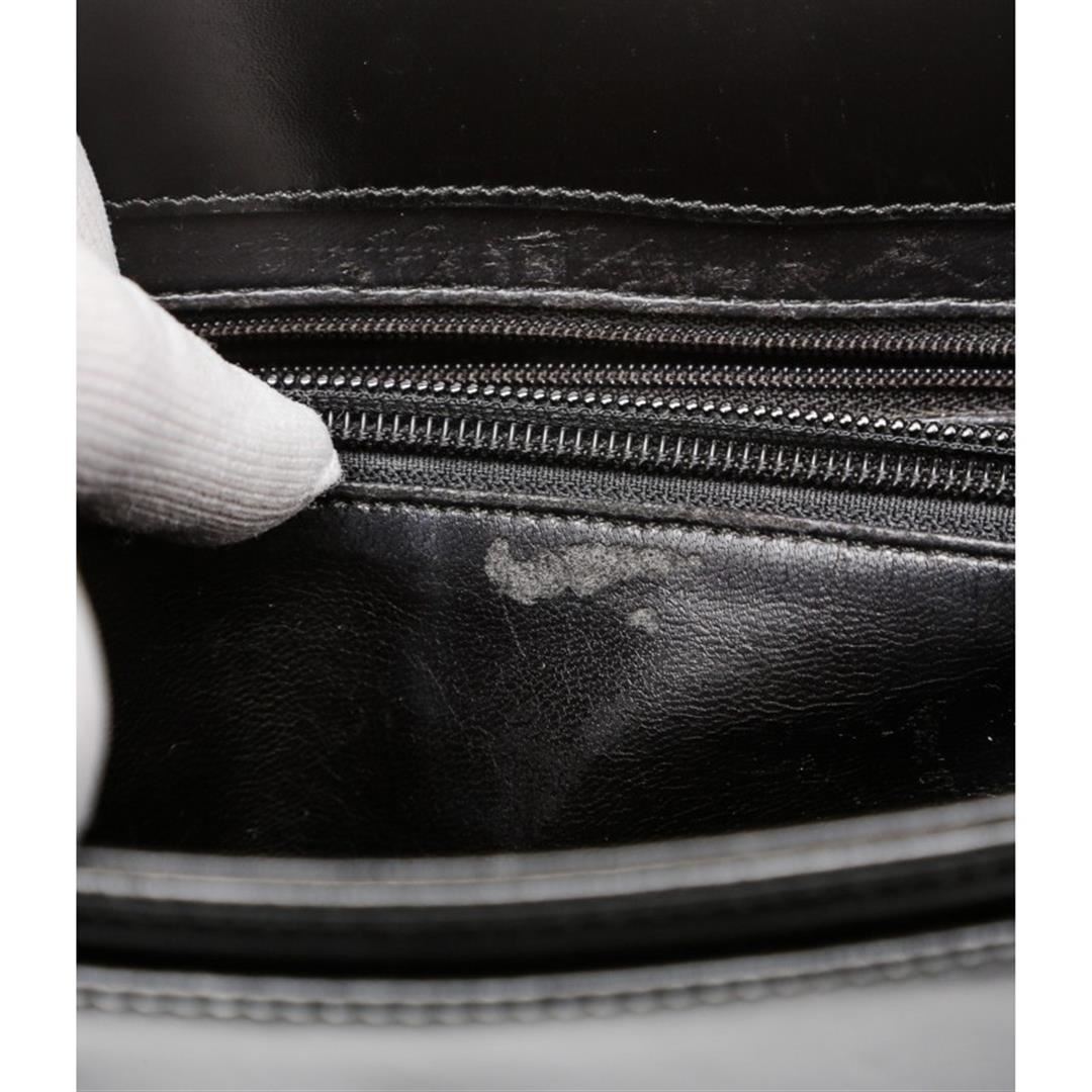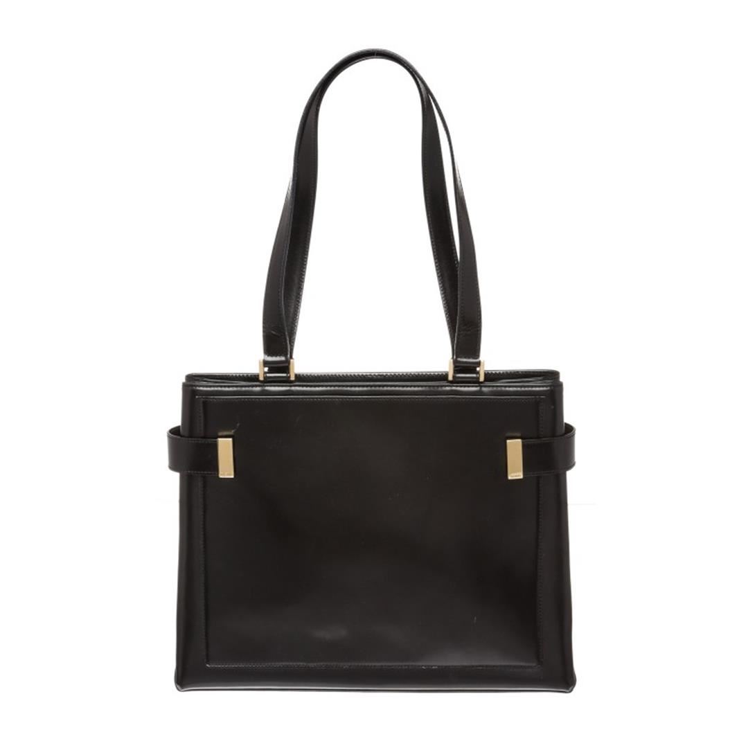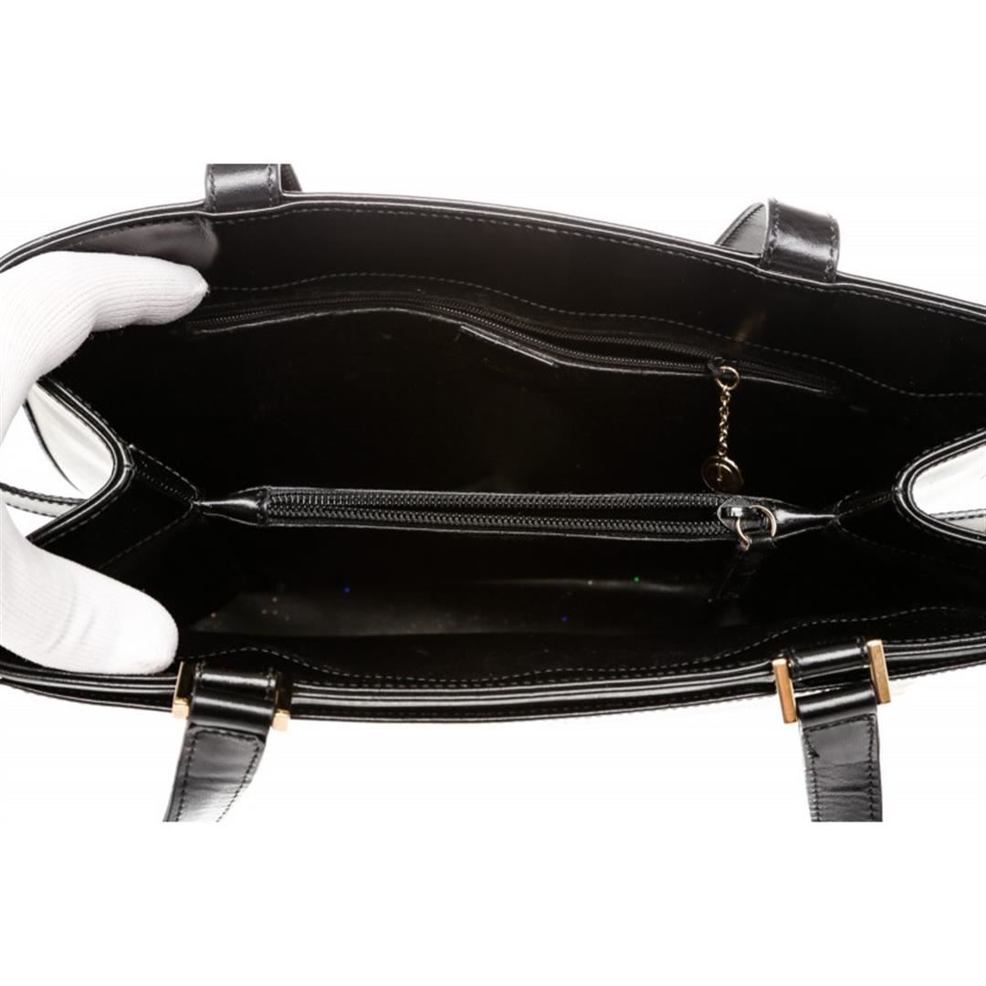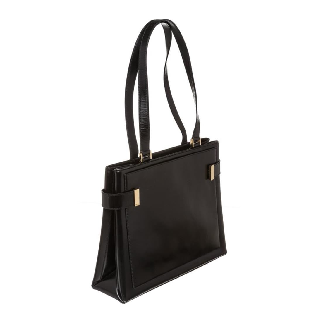 Interior is leather lined and contains three compartments with center compartment with full zipper closure. Interior side zipper pocket.
