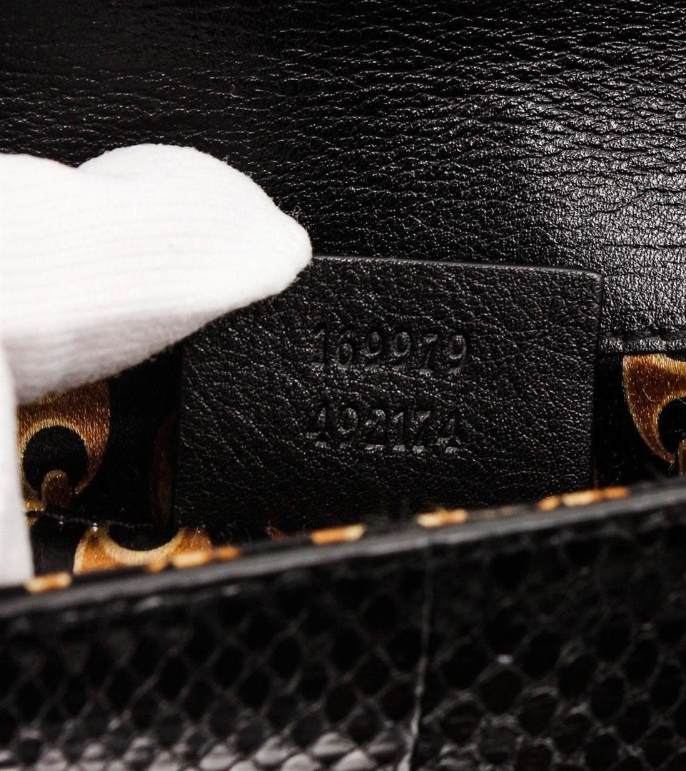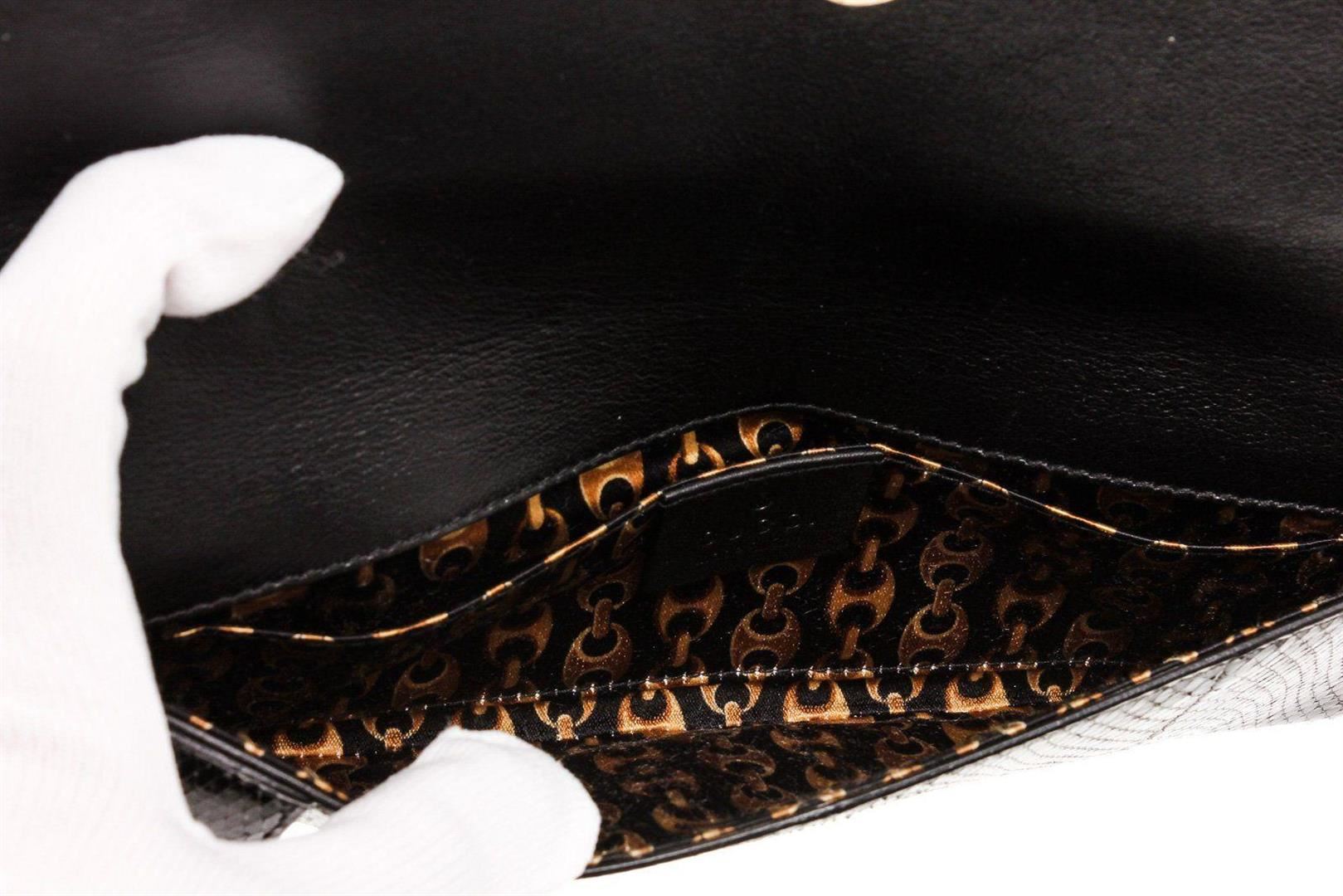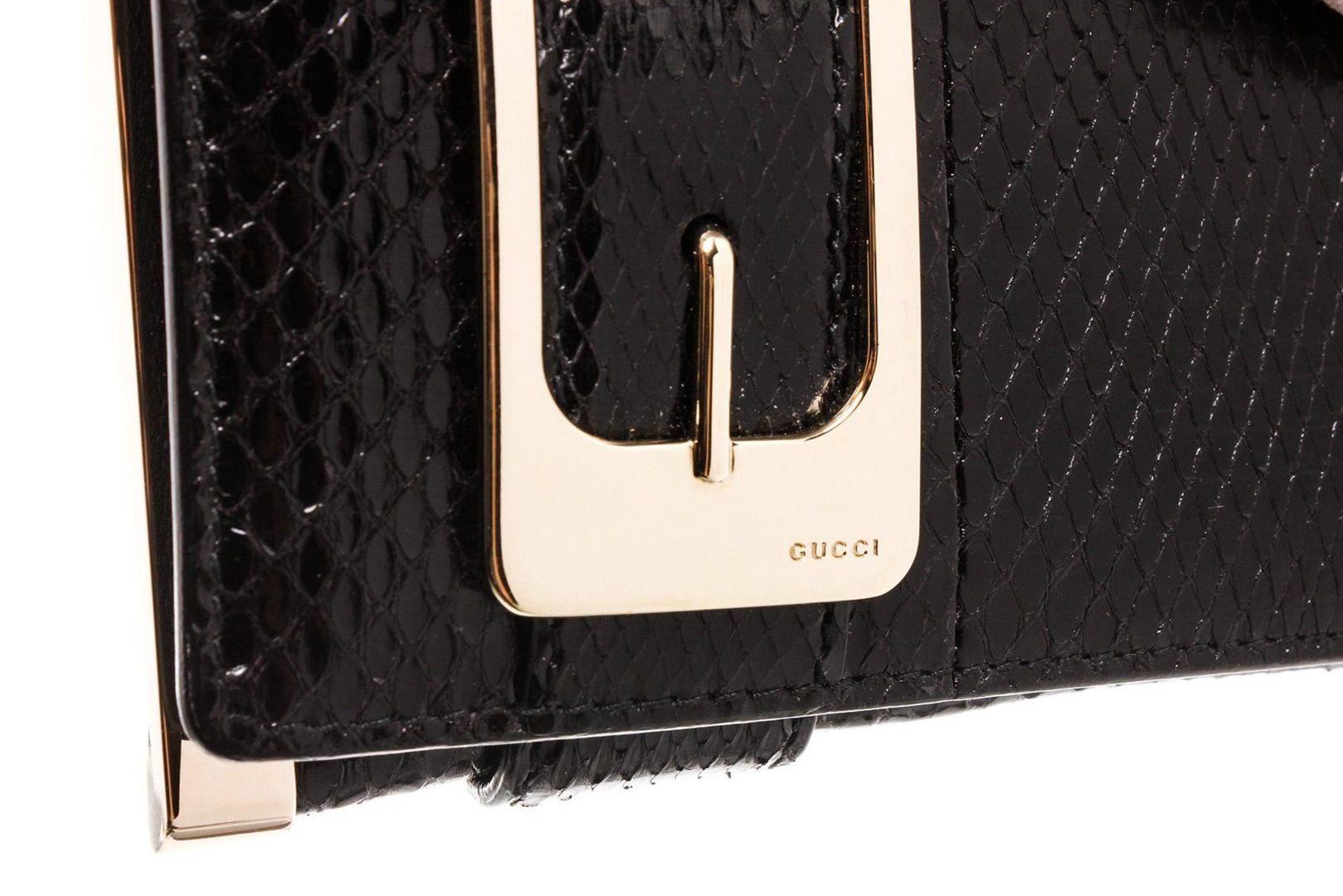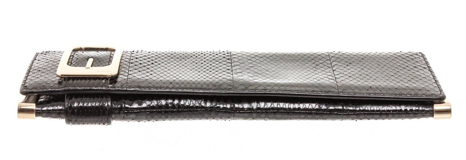 Black Snakeskin Gucci Romy Long clutch with silver-tone hardware, black and brown satin lining, single slit pocket at interior wall and magnetic snap closure at flap with buckle accent at front.