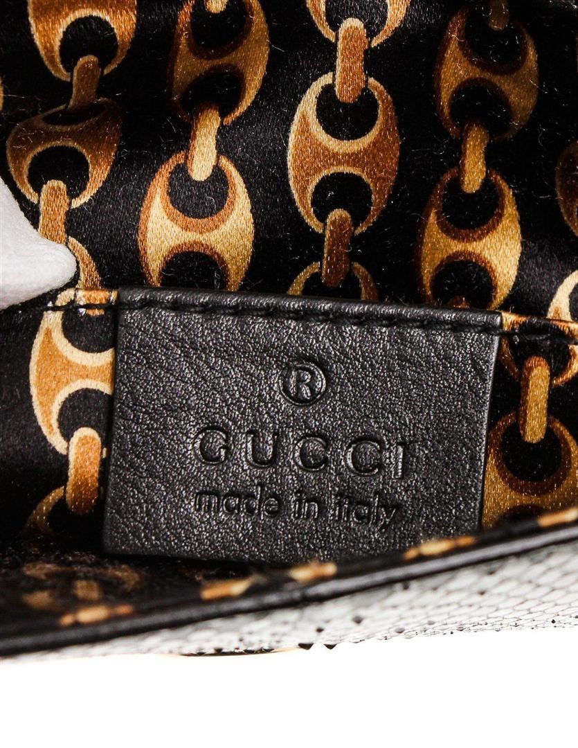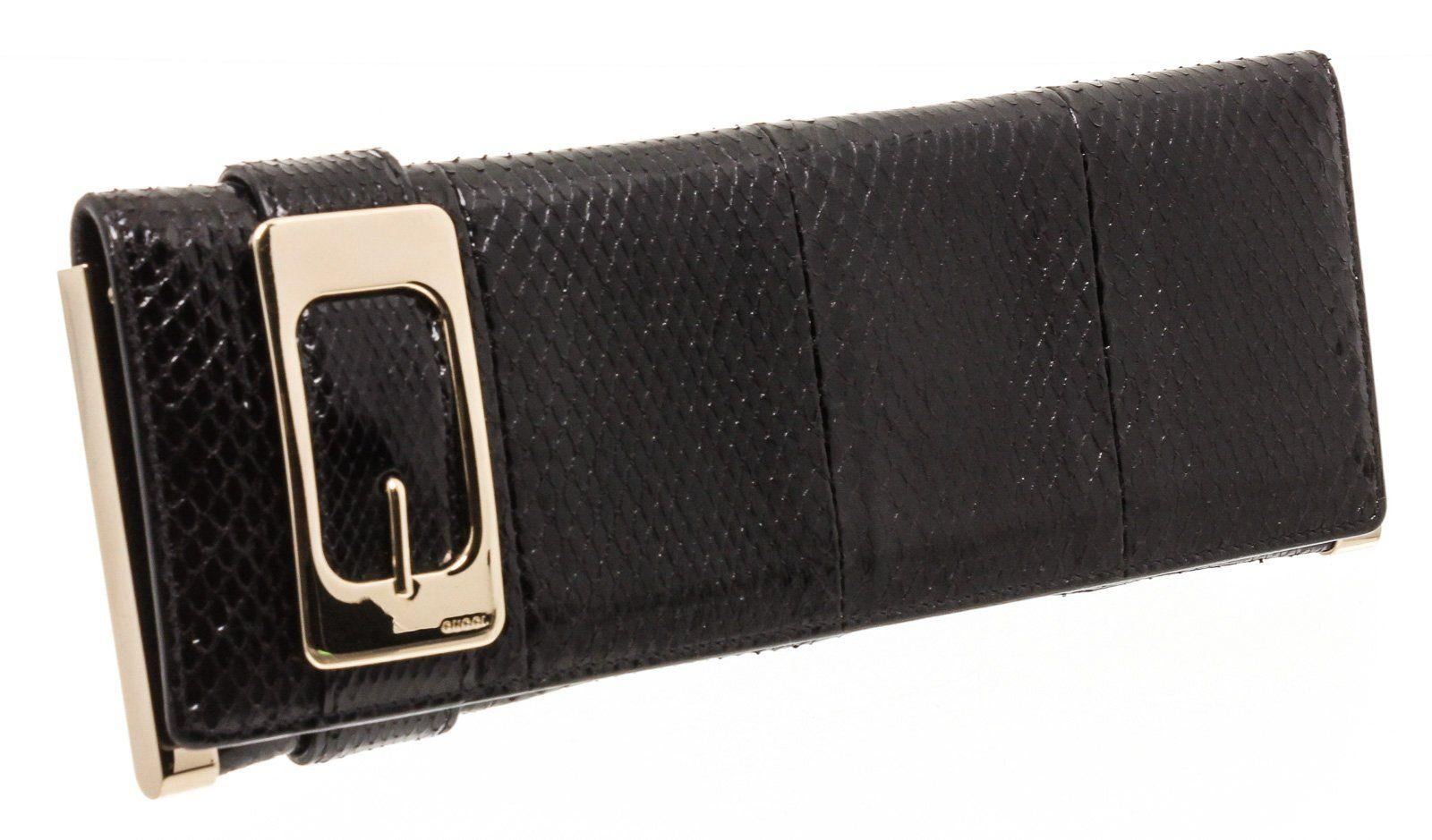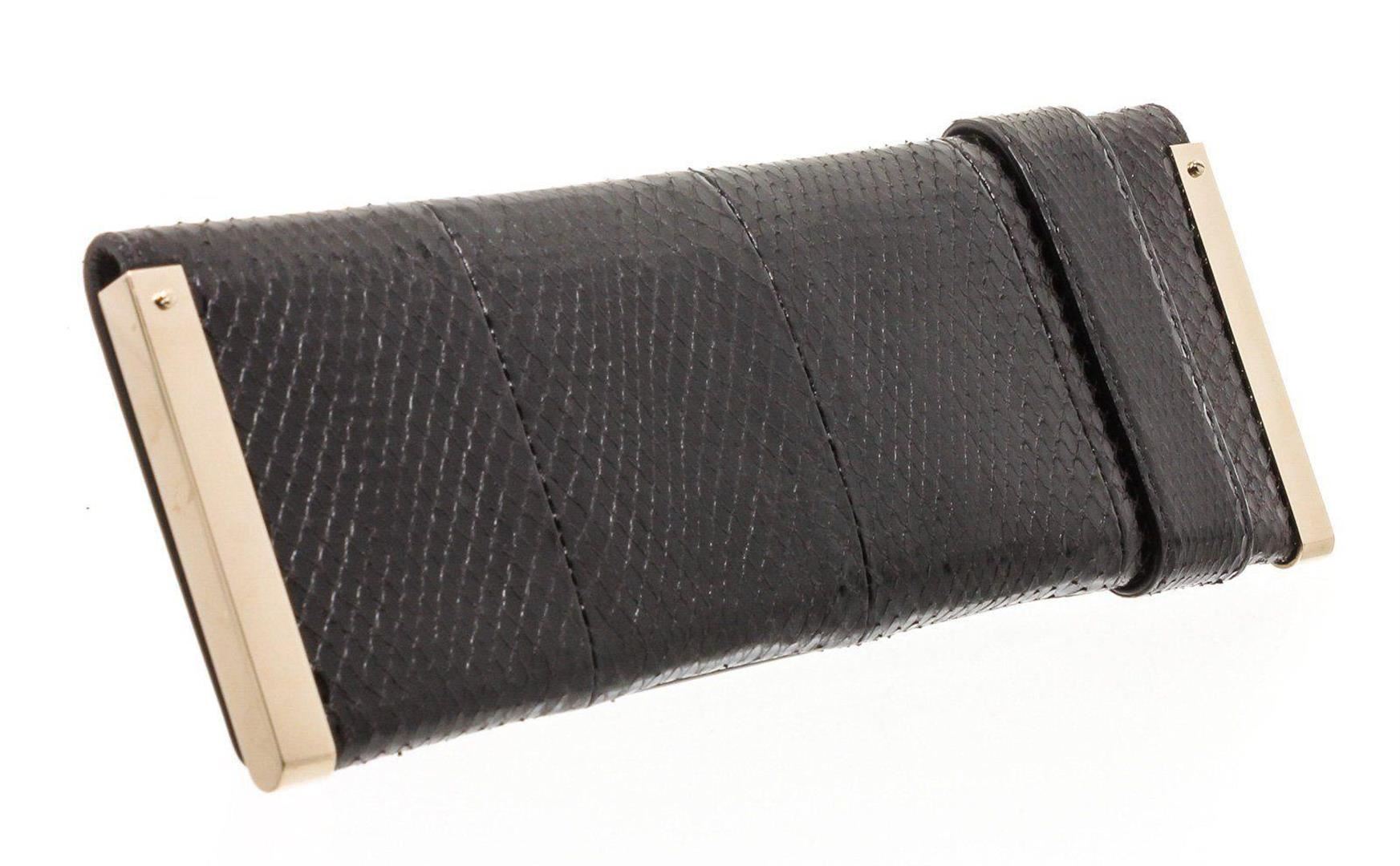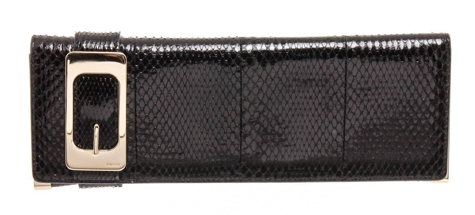 Black Snakeskin Gucci Romy Long clutch with silver-tone hardware, black and brown satin lining, single slit pocket at interior wall and magnetic snap closure at flap with buckle accent at front.