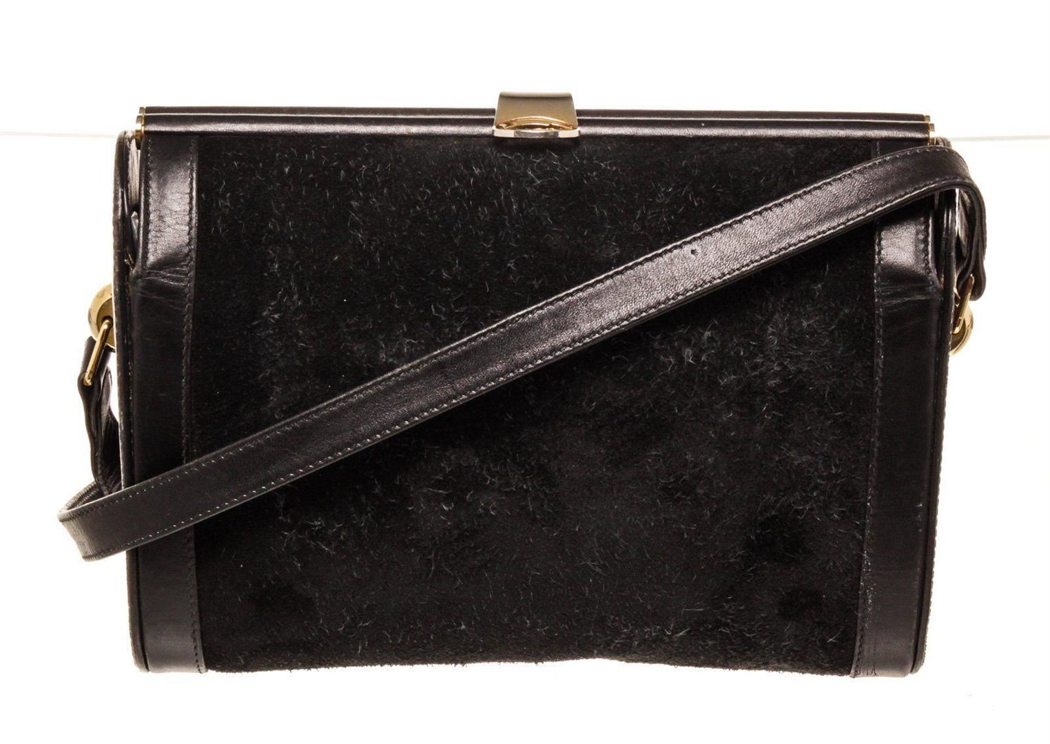 Gucci Black Suede Leather Vintage Clasp Shoulder Bag with leather gold-tone hardware, interior slip pockets, suede lining, shoulder strap and push lock closure.