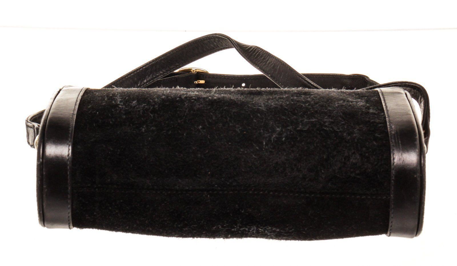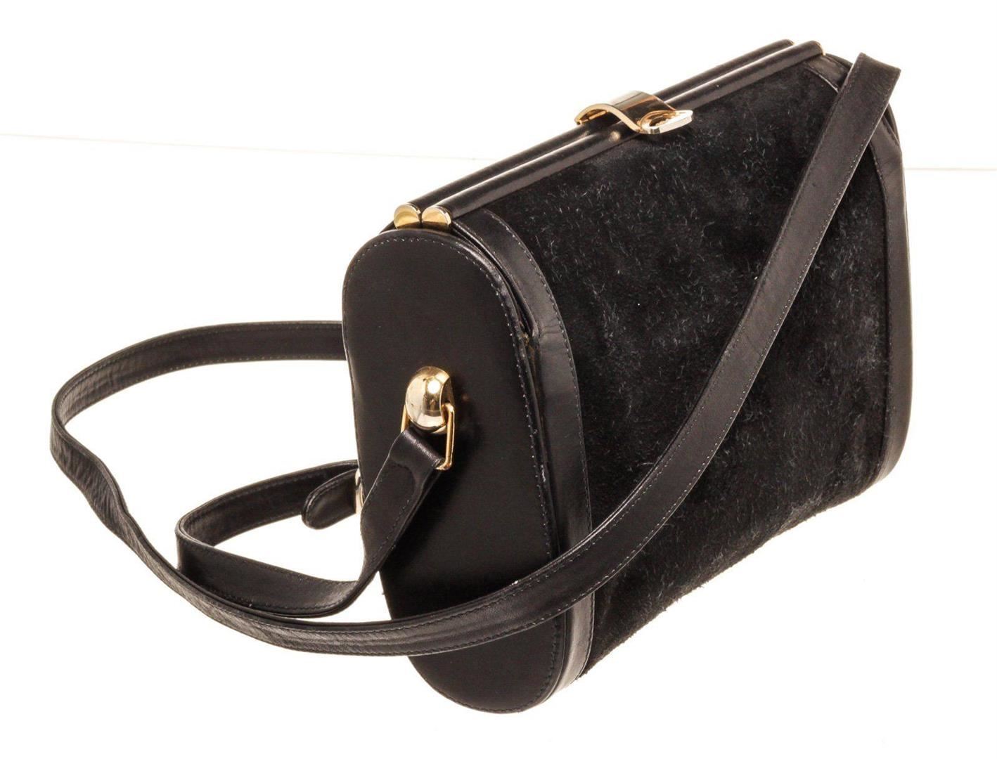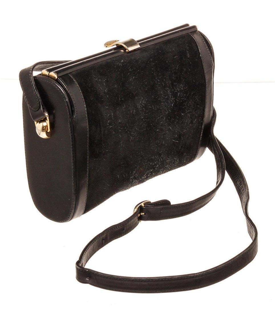 Gucci Black Suede Leather Vintage Clasp Shoulder Bag with leather gold-tone hardware, interior slip pockets, suede lining, shoulder strap and push lock closure.
