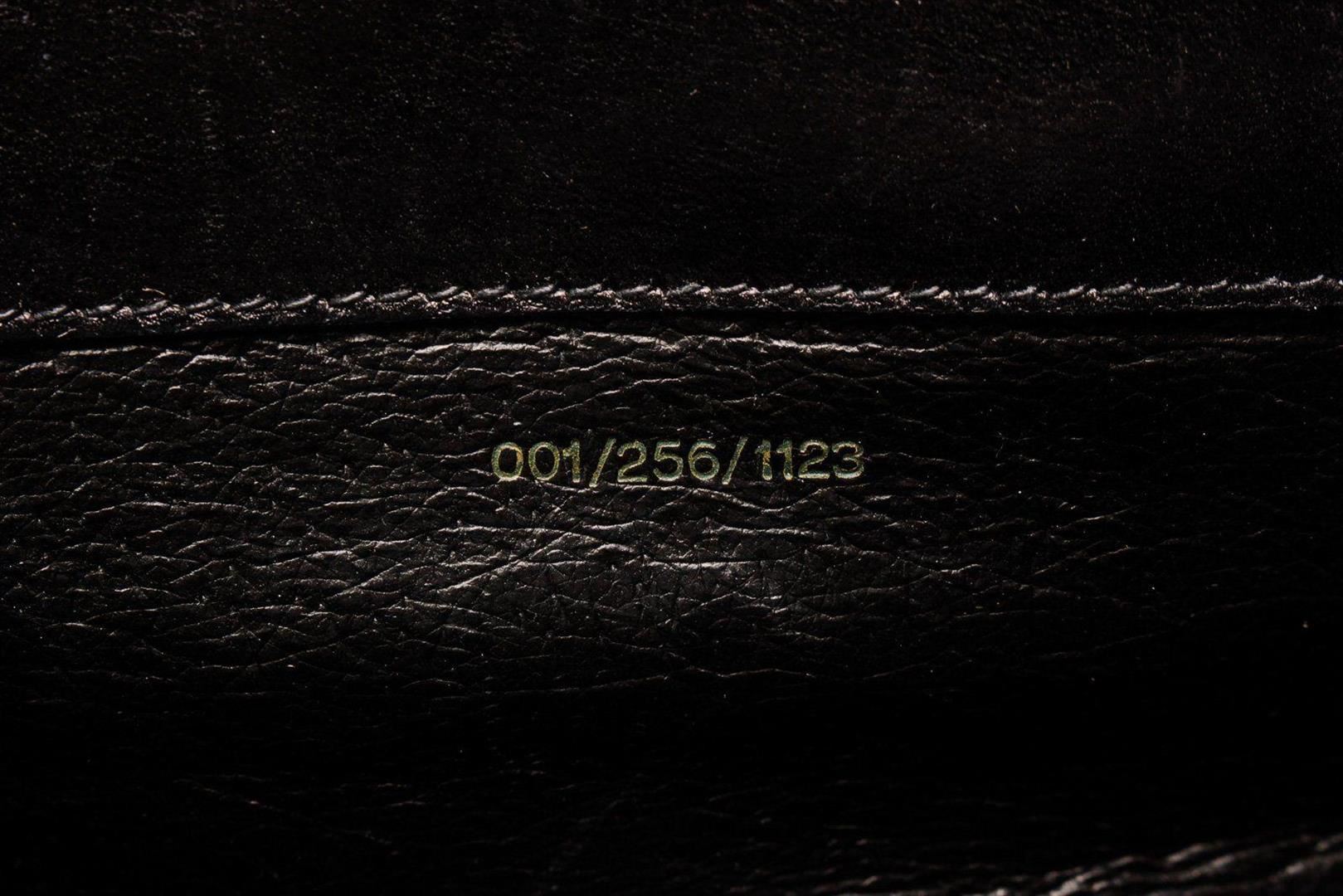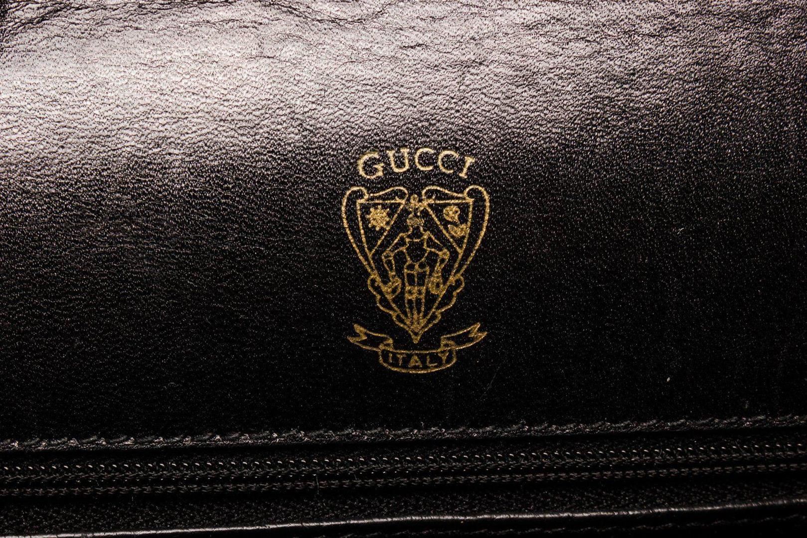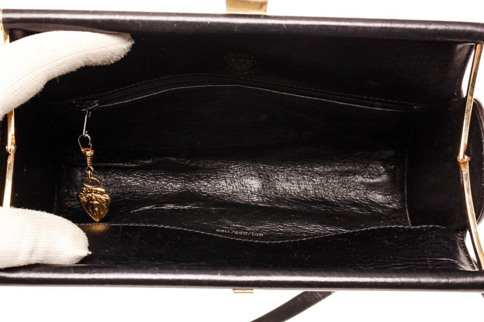 Gucci Black Suede Leather Vintage Clasp Shoulder Bag with leather gold-tone hardware, interior slip pockets, suede lining, shoulder strap and push lock closure.