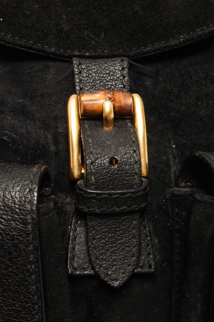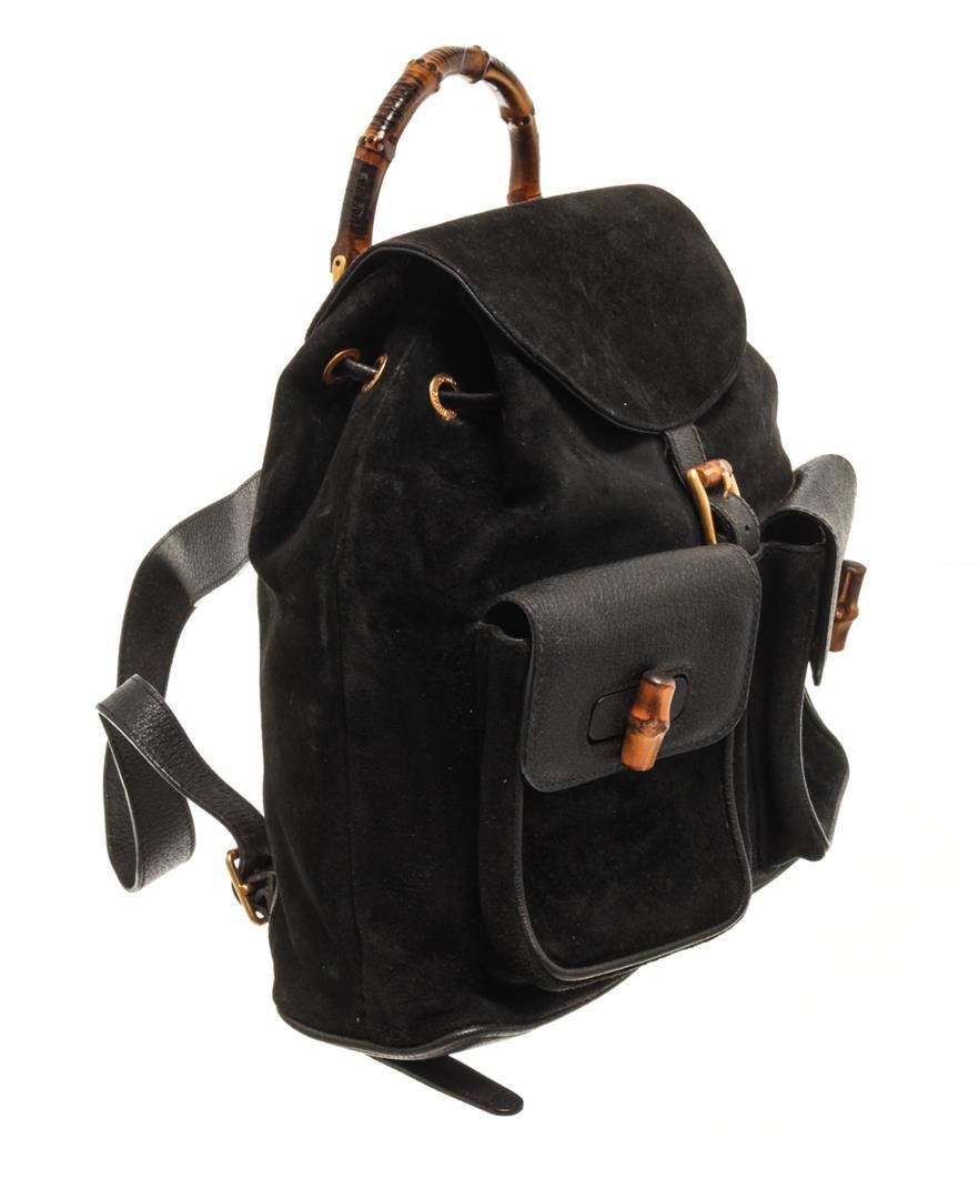 Gucci Black Suede Medium Vintage Bamboo Backpack. All available information is listed in the description and shown in the photos. Gucci Black Suede Medium Vintage Bamboo Backpack with top bamboo handle, two exterior pockets, two leather back straps, fabric lining, interior zipper pocket and buckle closure. Height: 12 in (30.48 cm), Width: 12 in (30.48 cm), Depth: 4 in (10.16 cm)