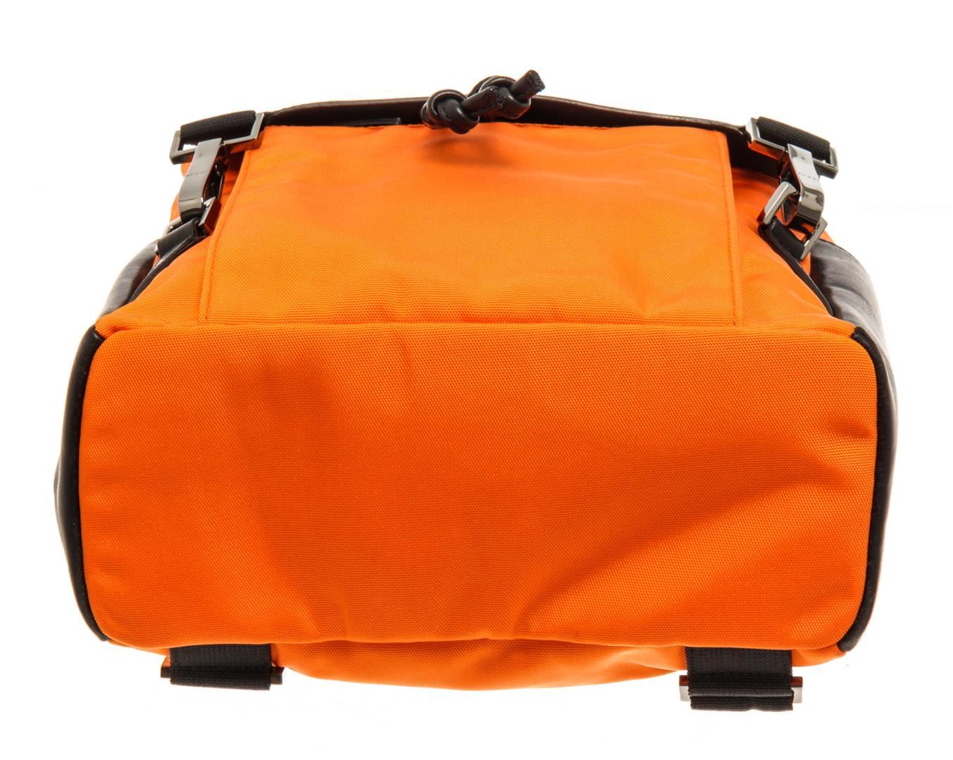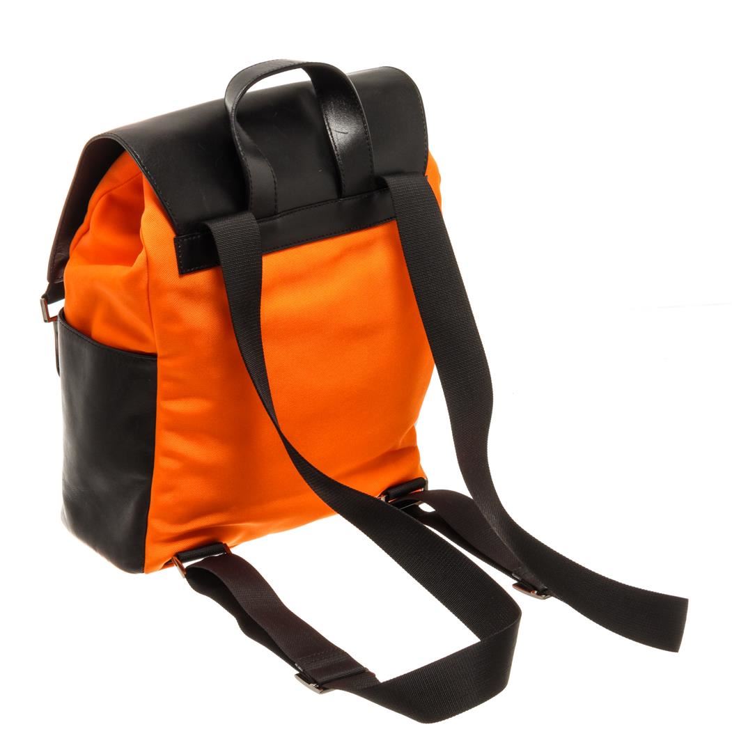 One Gucci Black and Orange Leather Nylon Backpack. Item is sold AS-IS. All available information is listed in the description and shown in the photo. Gucci black and orange leather nylon backpack with adjustable straps, top handle, black leather flap, drawstring and flap closure, silver-toned hardware, black nylon lining, and one interior zip pocket.
