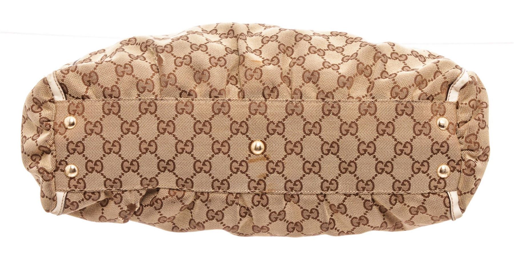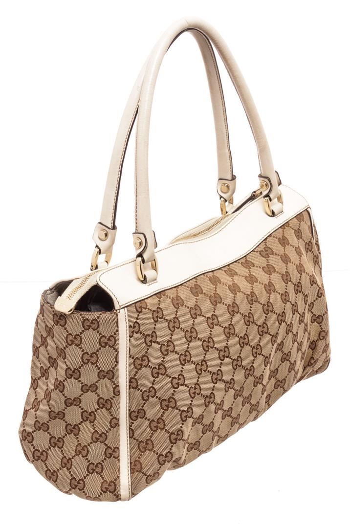 Gucci Brown Canvas D Tote Bag. All available information is listed in the description and shown in the photos. Gucci Brown Canvas D Tote Bag with gold-tone hardware, dual rolled top handles, gold-tone leather trim, black canvas lining, single slit pocket at interior wall and zip closure. CONDITION: Pre-Owned Good condition overall. Please refer to photographs.