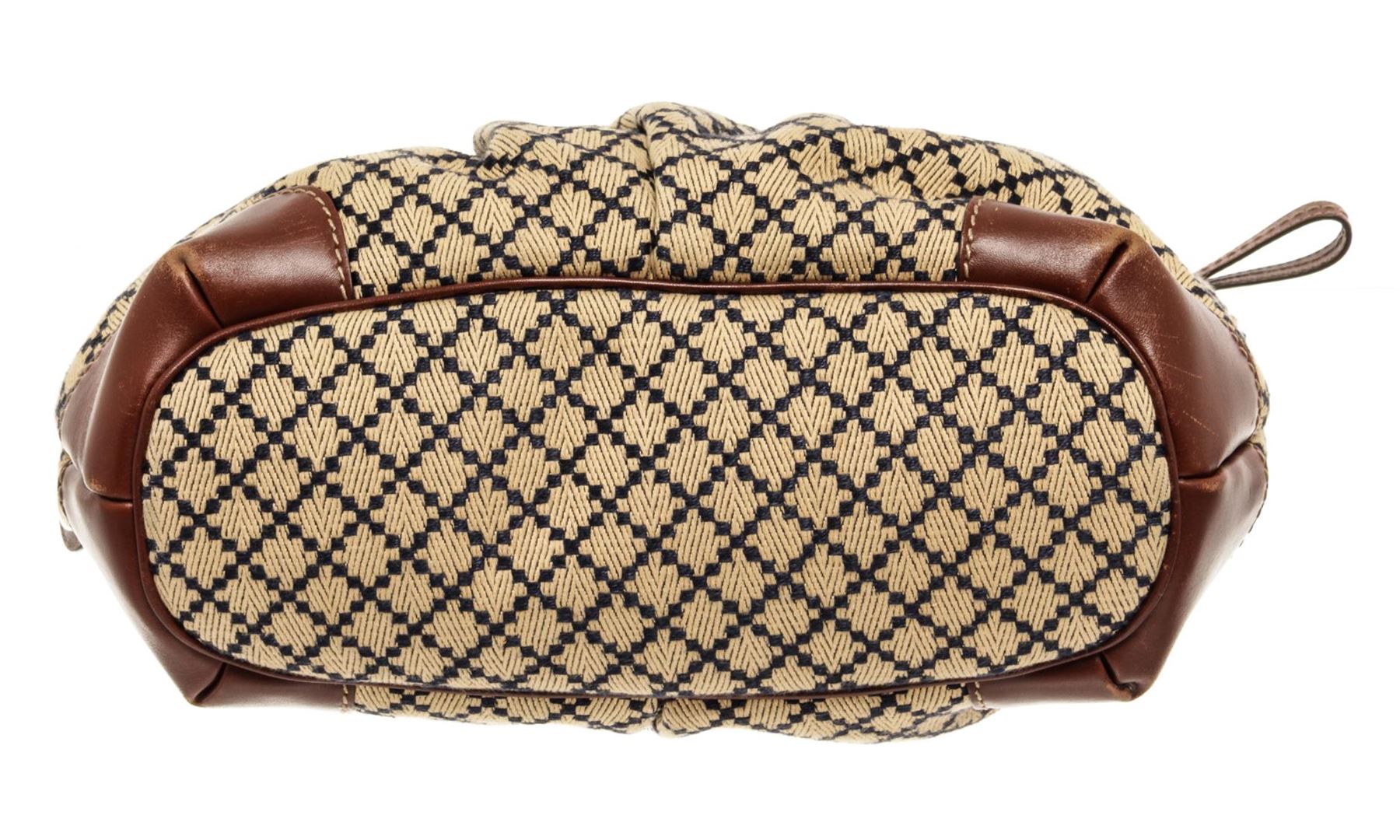One Gucci Brown Canvas Diamante Shoulder Bag. Item is sold AS-IS. All available information is listed in the description and shown in the photo. Gucci Brown Canvas Diamante Shoulder Bag with gold-tone hardware, handles, canvas lining & three interior pockets, zip closure at top. Please note: some discoloration on lining. 8.25"x11.25"x4.75" / 20.95 x 28.57 x 12.06 Cm, Shoulder Strap Drop: 4.5"