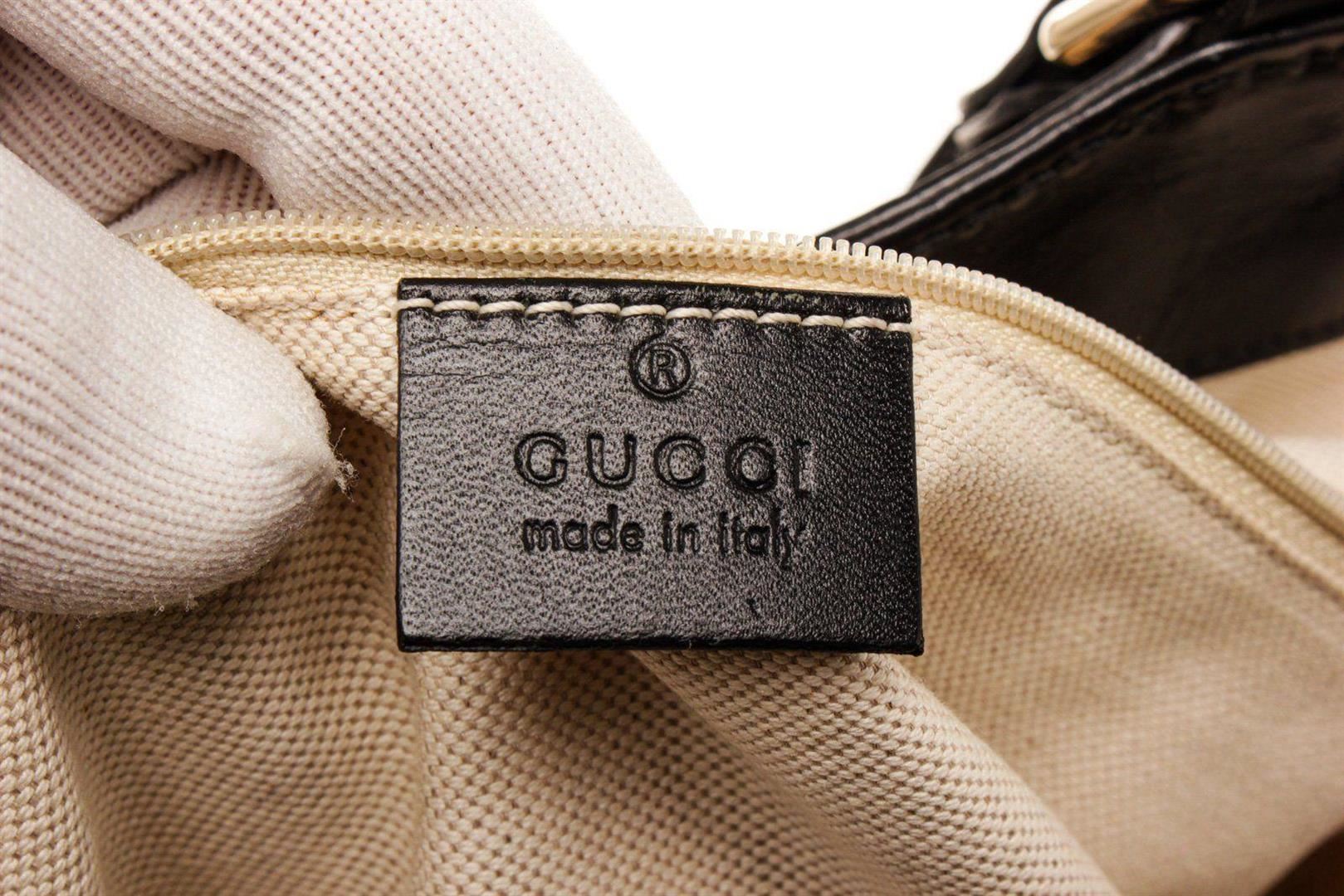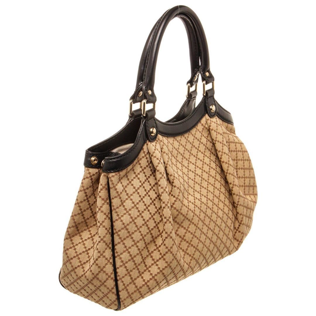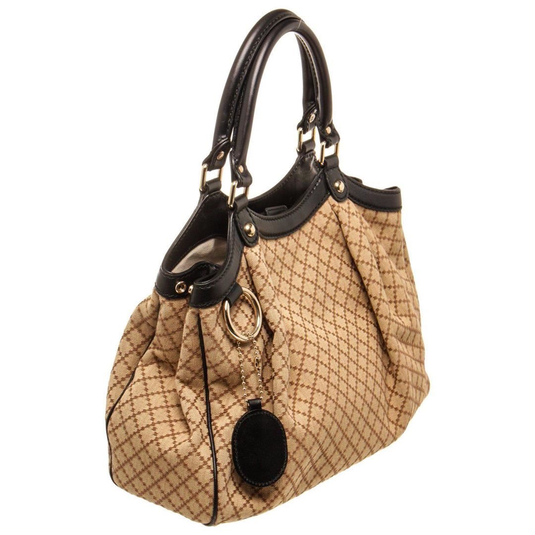 Gucci Brown Canvas Leather Sukey Medium Tote Bag with canvas leather gold-tone hardware, black leather trim, dual-rolled handles, detachable adjustable shoulder strap, creme canvas lining, three interior pockets; one with zip closure and zip closure at top.