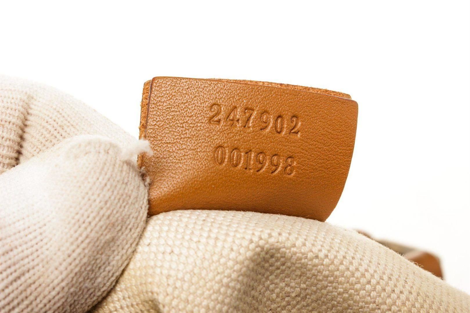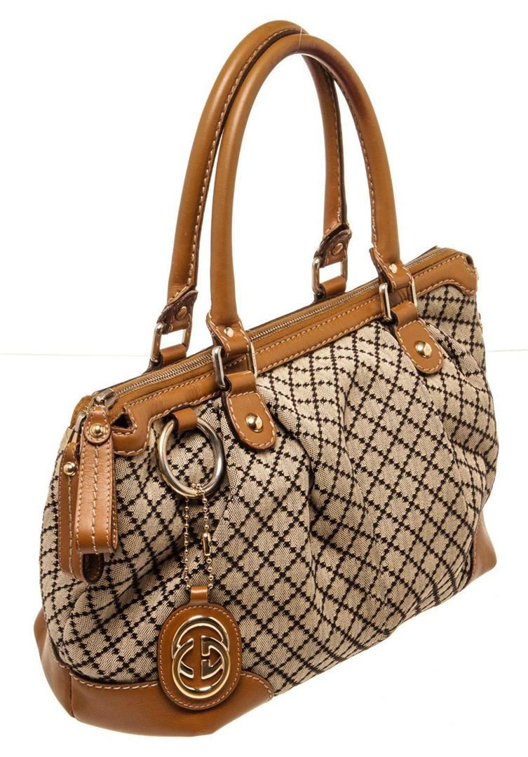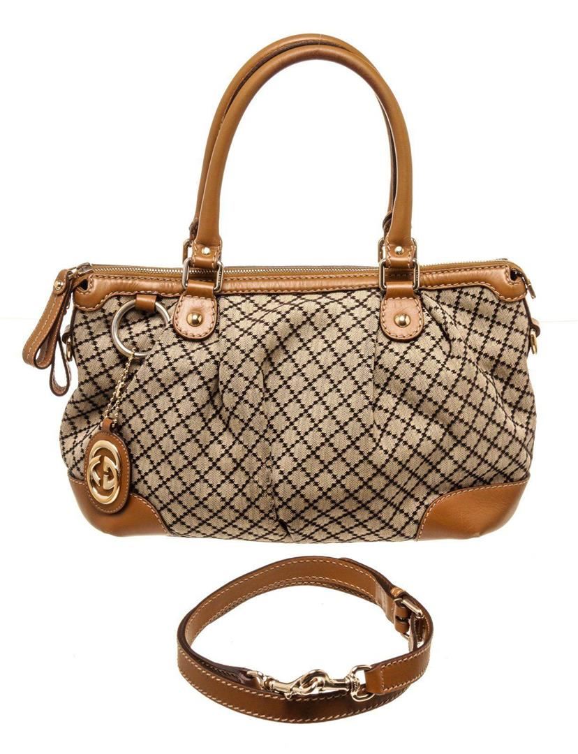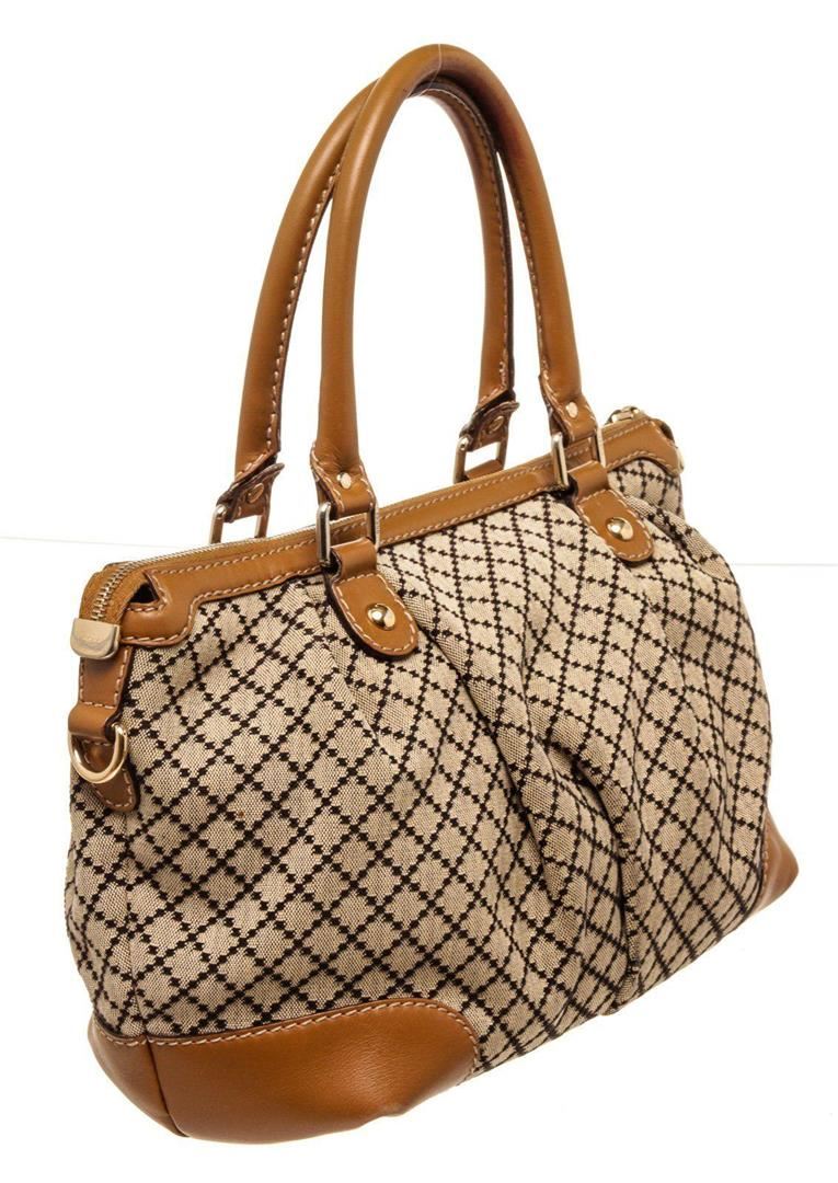 Gucci Brown Canvas Leather Sukey Tote Bag with canvas leather gold-tone hardware, black leather trim, dual-rolled handles, detachable adjustable shoulder strap, creme canvas lining, three interior pockets; one with zip closure and zip closure at top.